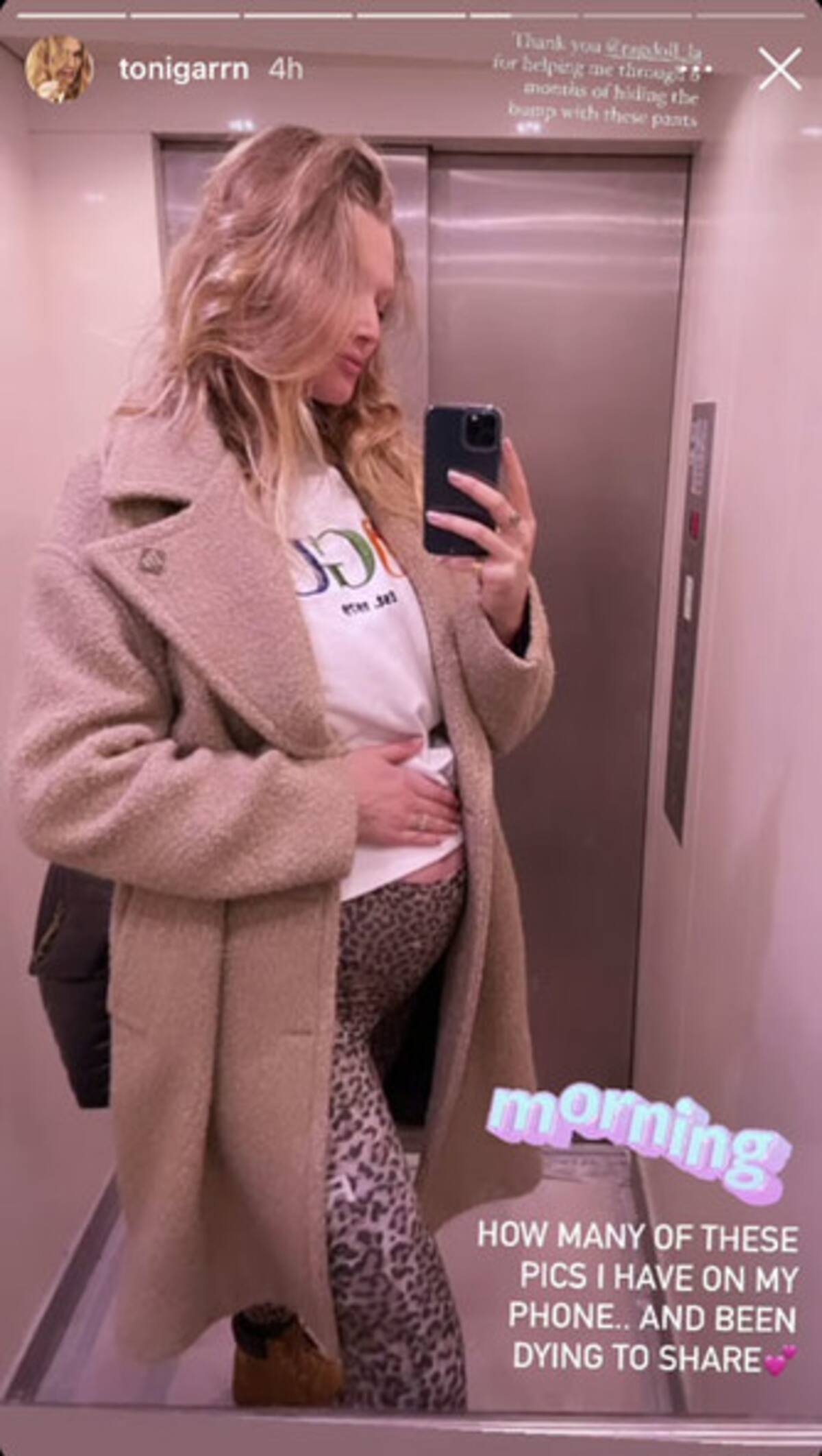 Poco después de la confirmación oficial (hace un par de días), la modelo publicaba una nueva imagen. En ella, aparecía en un ascensor frente al espejo y presumía de su embarazo. "Cuántas de estas fotos yo tengo en mi teléfono... y estaba muriendo por compartir", señala la modelo. Y da un agradecimiento a la firma de moda con la que ha podido mantener en secreto su estado: "Gracias Ragdoll LA por ayudarme a ocultar esta tripita estos meses con estos pantalones".