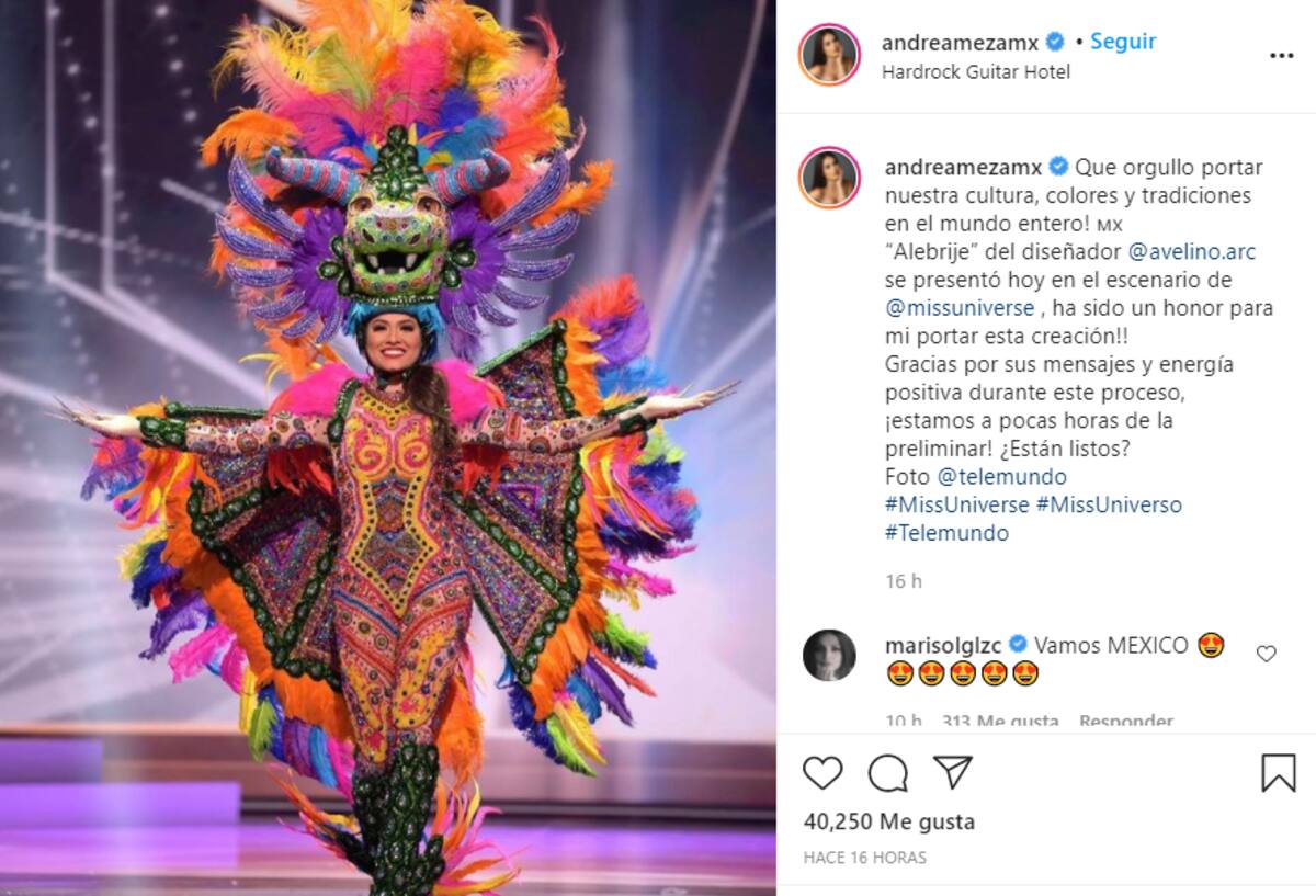 “Que orgullo portar nuestra cultura, colores y tradiciones en el mundo entero. ´Alebrije´, del diseñador Avelino, se presentó hoy en el escenario de Miss Universo, ha sido un honor para mí portar esta creación”, expresó Meza en su publicación.