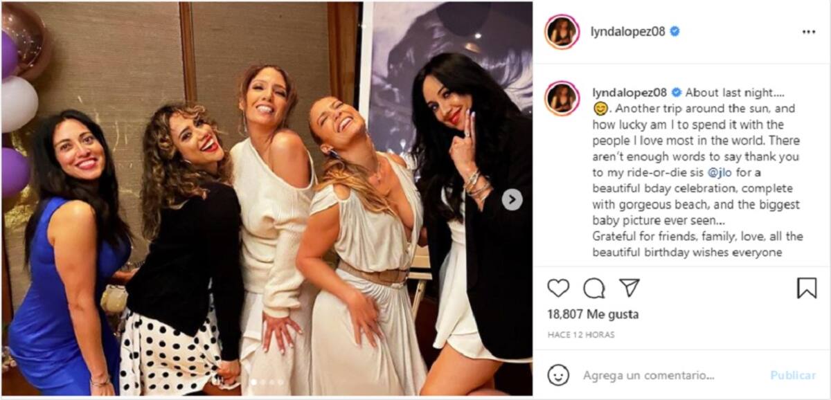 Al respecto de su celebración, Lynda escribió: “Sobre lo de anoche…. Otro viaje alrededor del sol, y ¡qué suerte tengo de pasarlo con las personas que más quiero en el mundo!, no hay suficientes palabras para agradecerle a mi hermana @jlo por una hermosa celebración de cumpleaños, con una hermosa playa y la foto de bebé más grande jamás vista... Agradecida por los amigos, la familia, el amor, todos los hermosos deseos de cumpleaños que todos enviaron hoy... y recuerdos que se quedarán para siempre. #amor #familia #yaybirthdays!!”