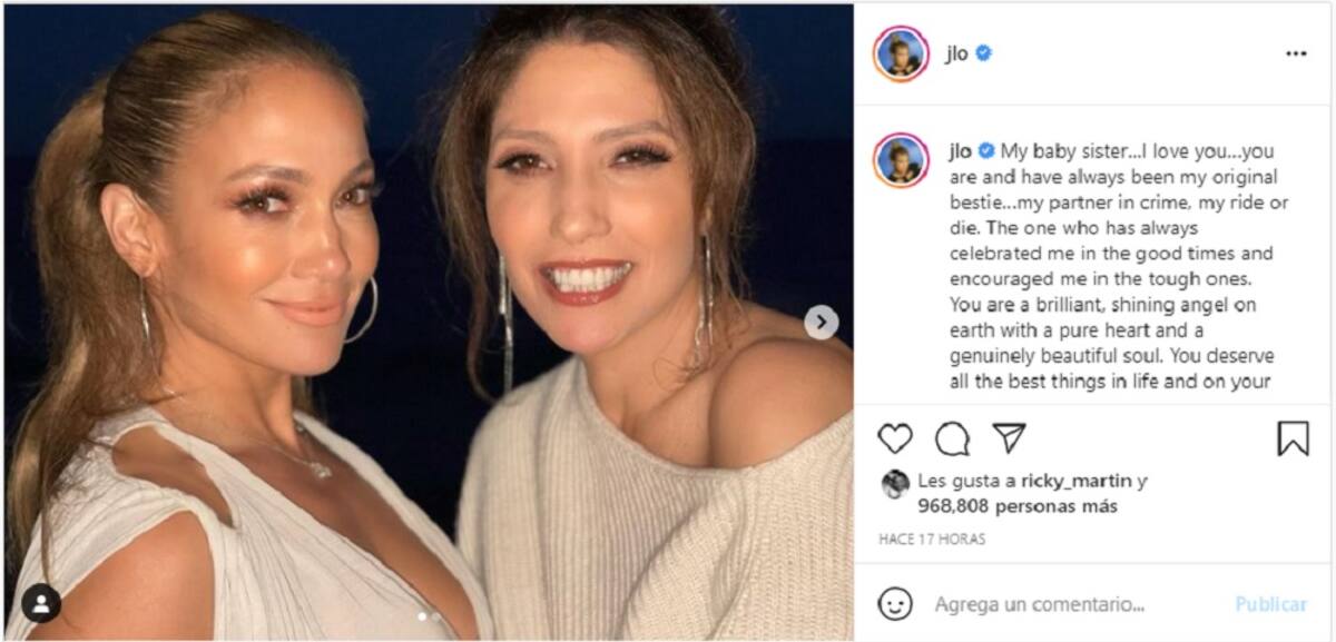 Por su parte, JLo respondió: “Mi hermanita... te amo... eres y siempre has sido mi mejor amiga... mi cómplice, mi paseo o morir. Quien siempre me ha celebrado en los buenos tiempos y me ha animado en los duros. Eres un ángel brillante y resplandeciente en la Tierra, con un corazón puro y un alma genuinamente hermosa. Te mereces las mejores cosas de la vida y en tu cumpleaños te deseo paz, salud, felicidad, éxito y lo más importante... todo el amor que tu corazón pueda desear. Feliz cumpleaños @lyndalopez08 !!!!!# Sitienes26Yotengo28 !! #Hermanas #Familia #Amor Verdadero”.