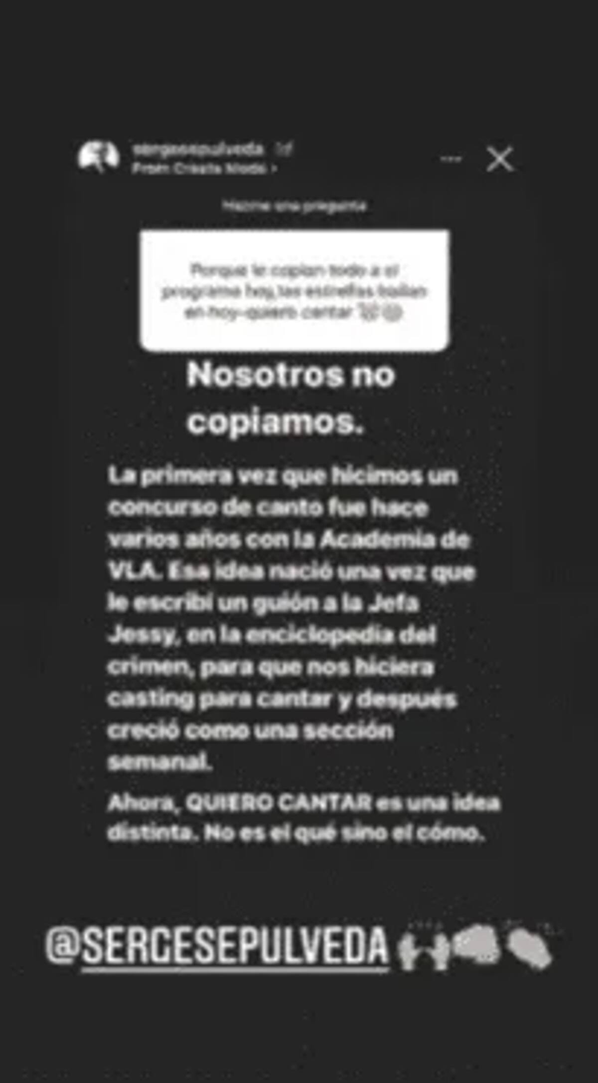 En respuesta, el conductor Sergio Sepúlveda negó a través de sus historias que “Quiero Cantar” sea un plagio del reality de baile de “Hoy”.
