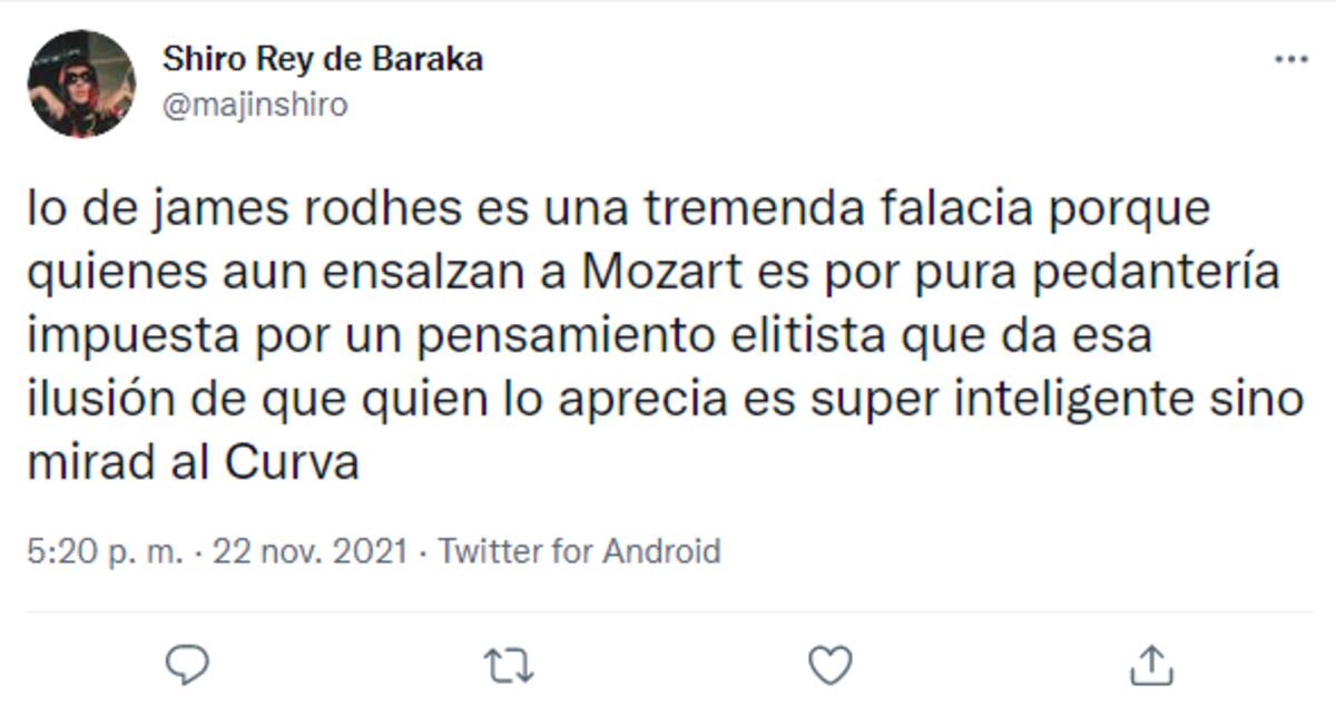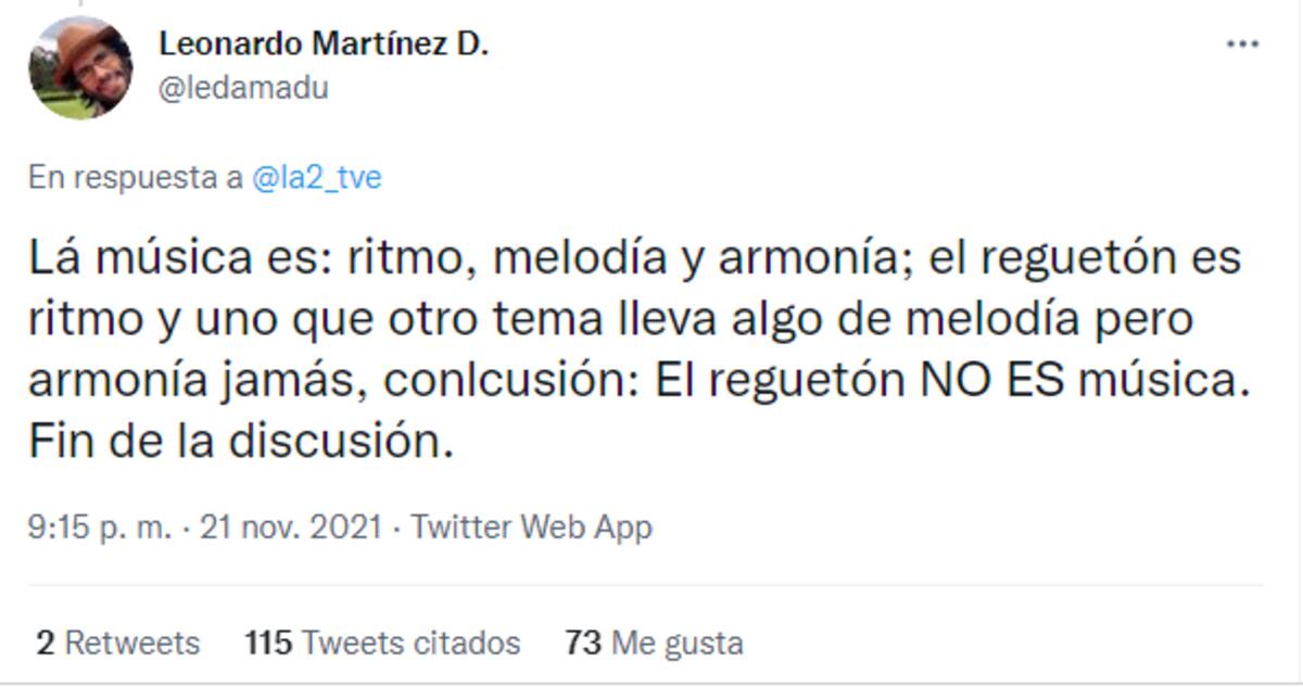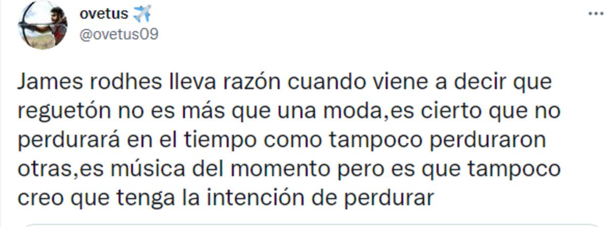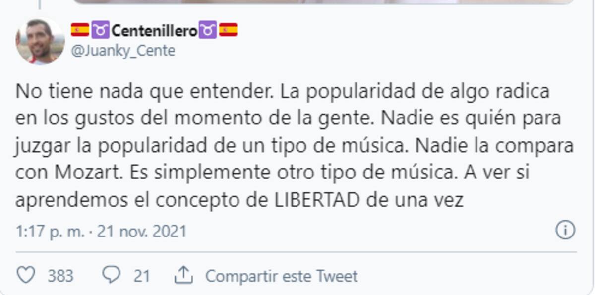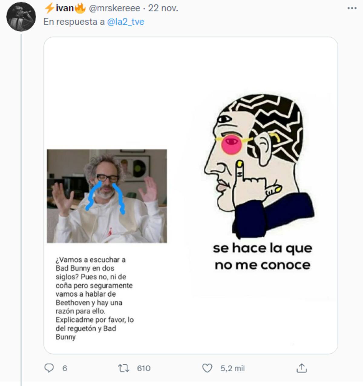 “Y no voy a decir, no quiero decir que, de alguna manera, Beethoven sea más meritorio que Leiva o Rosalía, ni de coña. Claramente hay canciones de Serrat, Sabina también, Chalie García, de Argentina. […] seguro hay canciones que en cinco o seis décadas vamos a escuchar y decir ‘qué fuerte, ya tengo escalofríos', pero explicadme por favor lo del reguetón y Bad Bunny. Te lo juro, os lo juro, no estoy diciendo que es una mierda, pero literalmente no entiendo la popularidad de este tipo de música”, concluyó.