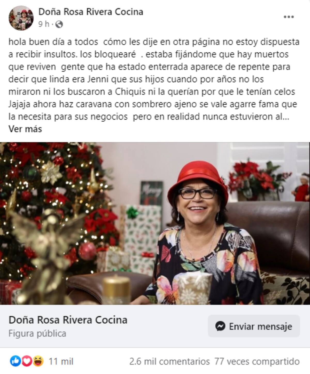 Por otro lado, Rosa Saavedra, matriarca de la dinastía Rivera, usó su perfil de Facebook para pedir que no le escribieran más insultos, pues parece que luego del escándalo todos los miembros de la familia han sido víctimas de ataques en redes sociales. También mencionó que Chiquis tuvo una relación distante con su madre, en un intento por restarle importancia a sus declaraciones.