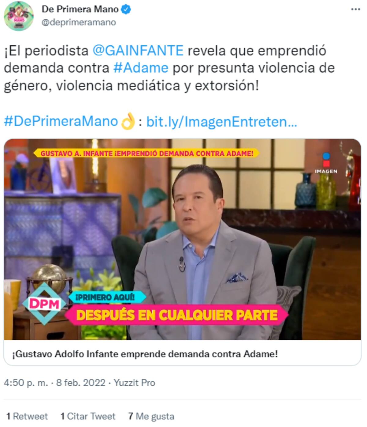 Por su parte, desde su cuenta personal de Twitter, el periodista de espectáculos compartió una publicación que causó revuelo entre los usuarios de la red social luego de leer de que Infante quería ver entre las rejas al actor: “Compañeros estoy en condiciones de confirmarles que DENUNCIÉ PENALMENTE a Alfredo Adame por 3 delitos. Creo que merece cárcel”, escribió.