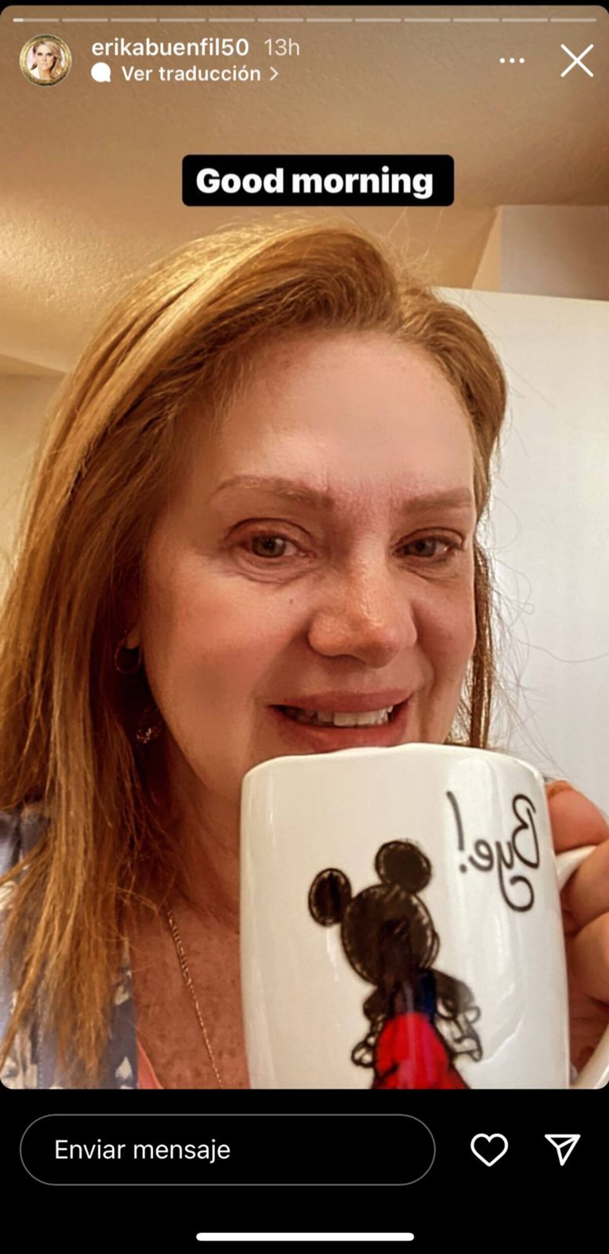 En la imagen se puede notar que Buenfil acaba de tomarse una ducha y estaba disfrutando de una taza de café, mientras se tomaba una “selfie” para saludar a cada uno de sus fanáticos.