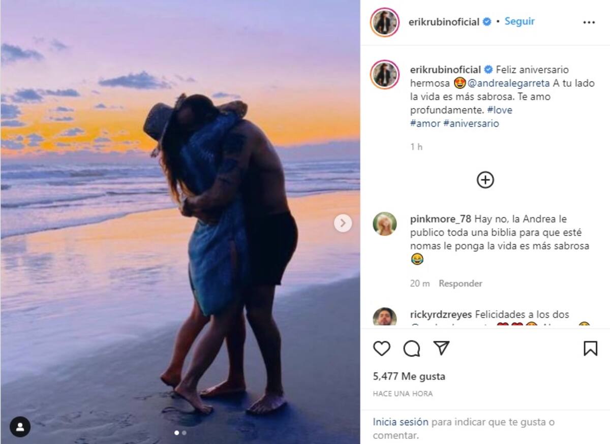 Por su parte, Erik Rubín manifestó: “Feliz aniversario hermosa ��@andrealegarreta A tu lado la vida es más sabrosa. Te amo profundamente. #love #amor #aniversario”.