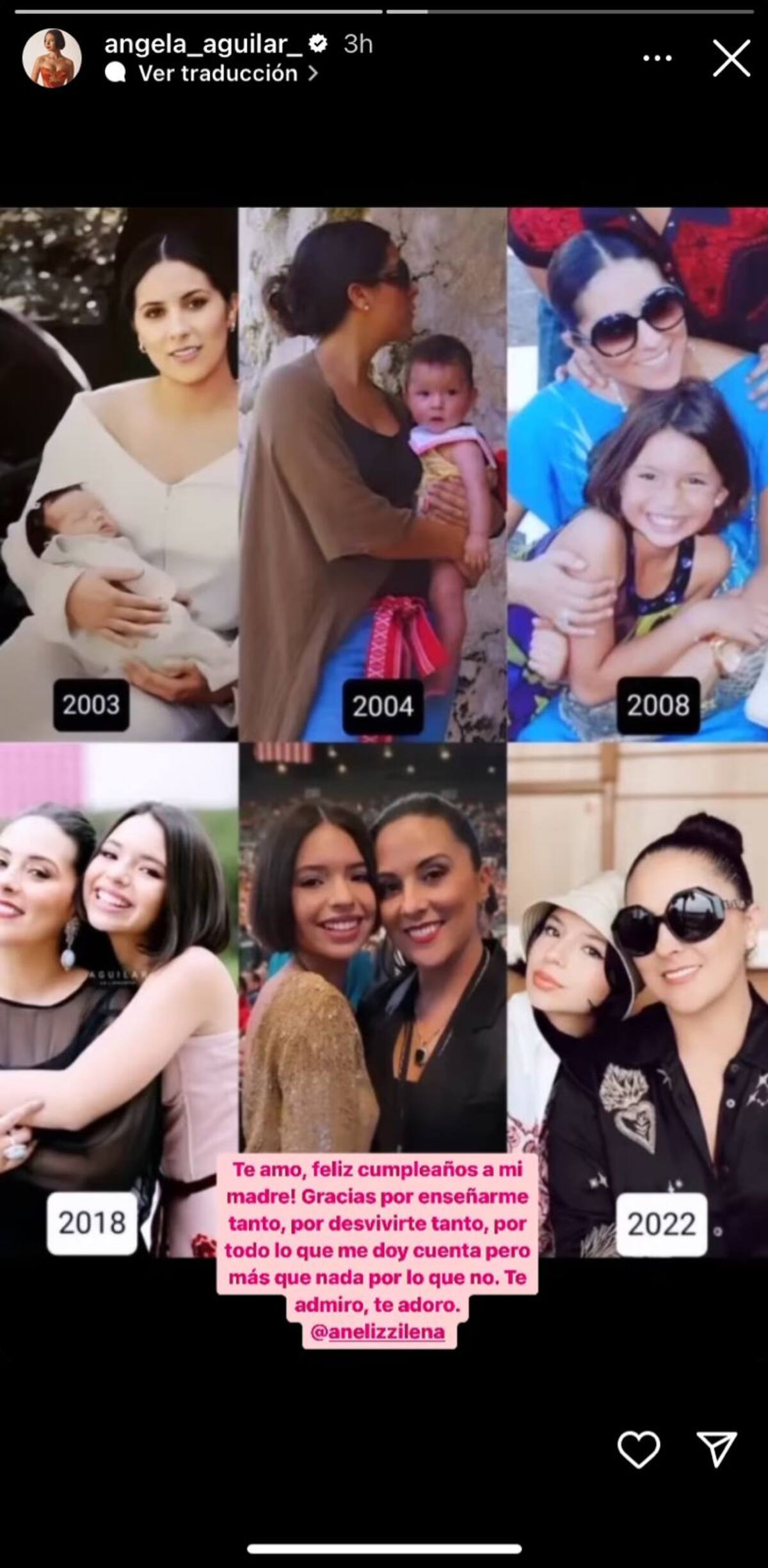 Es por eso que la intérprete de “En Realidad” compartió un collage lleno de fotografías desde el nacimiento de Ángela en 2003 hasta una de la actualidad donde ambas aparecen en uno de sus viajes.