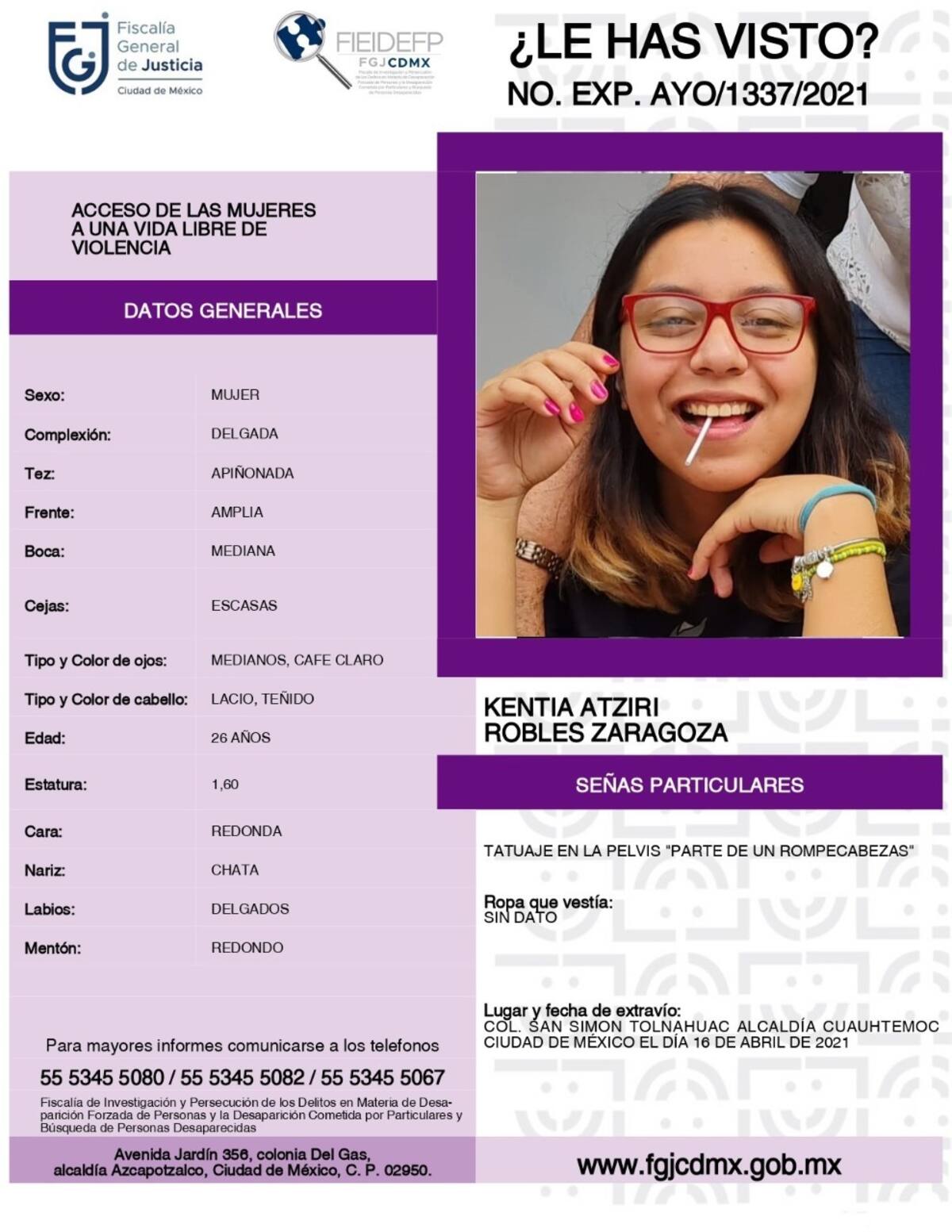 CIUDAD DE MÉXICO.- Kentia Atziri Robles Zaragoza, de 26 años, salió de su domicilio ubicado en San Simón Tolnahuac, alcaldía Cuauhtémoc en la Ciudad de México el 16 de abril hacia una entrevista de trabajo por Metro la Raza, eso fue lo que le dijo a su familia.