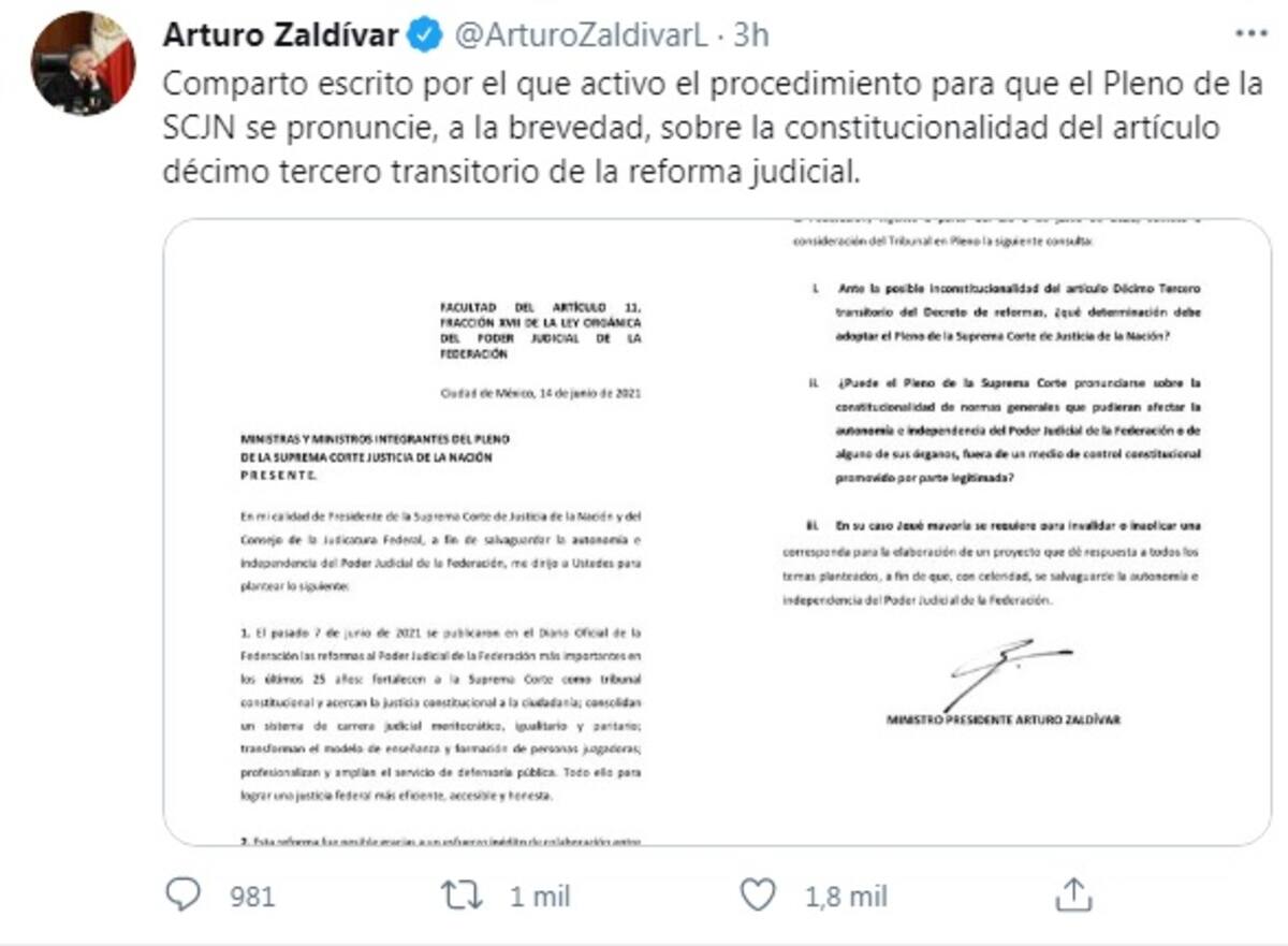 Comparto escrito por el que activo el procedimiento para que el Pleno de la SCJN se pronuncie, a la brevedad, sobre la constitucionalidad del artículo décimo tercero transitorio de la reforma judicial”, escribió Zaldívar en Twitter.