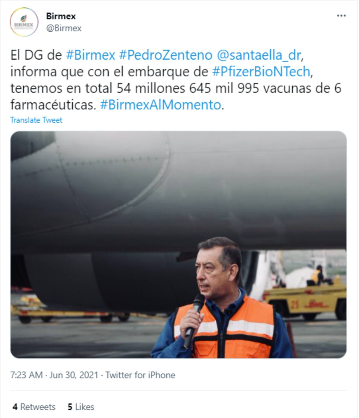 El titular de Birmex, Pedro Zenteno, informó que este es el segundo embarque de vacunas antiCovid que llega al País el día de hoy, ya que minutos antes arribó un vuelo con un millón de dosis de Sinovac, y se espera que dentro de pocas horas llegue el tercero y último lote del día.