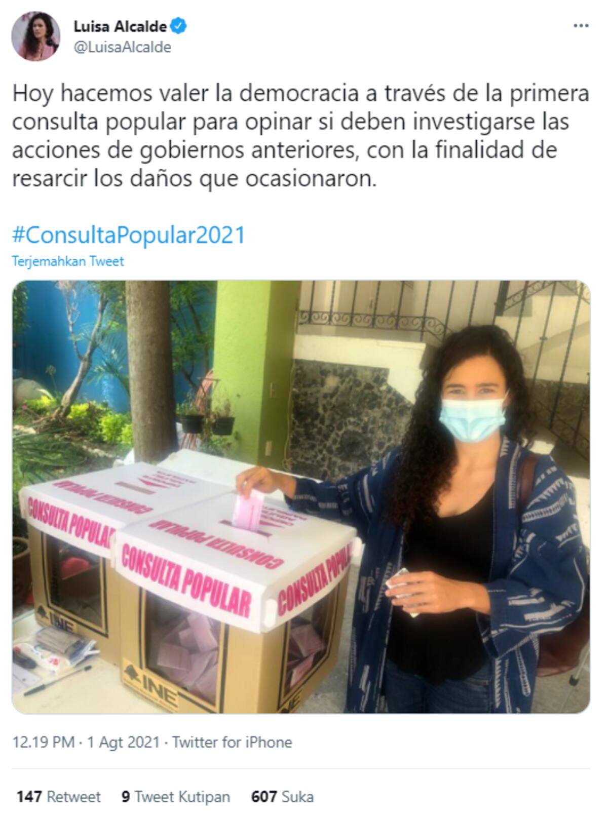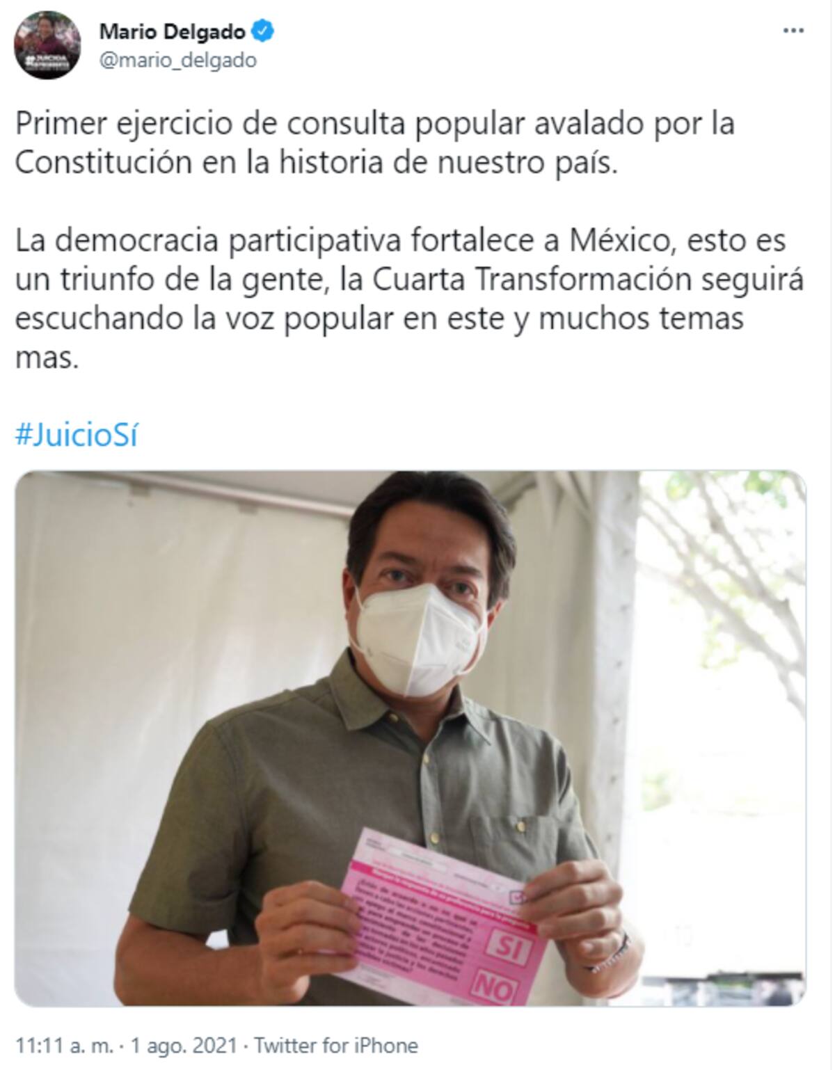 CIUDAD DE MÉXICO.- Luisa María Alcalde, secretaria del Trabajo y Previsión Social, publicó en su cuenta de Twitter que emitió su respectivo voto en la Consulta Popular sobre si se debe o no enjuiciar a actores políticos de años anteriores.
