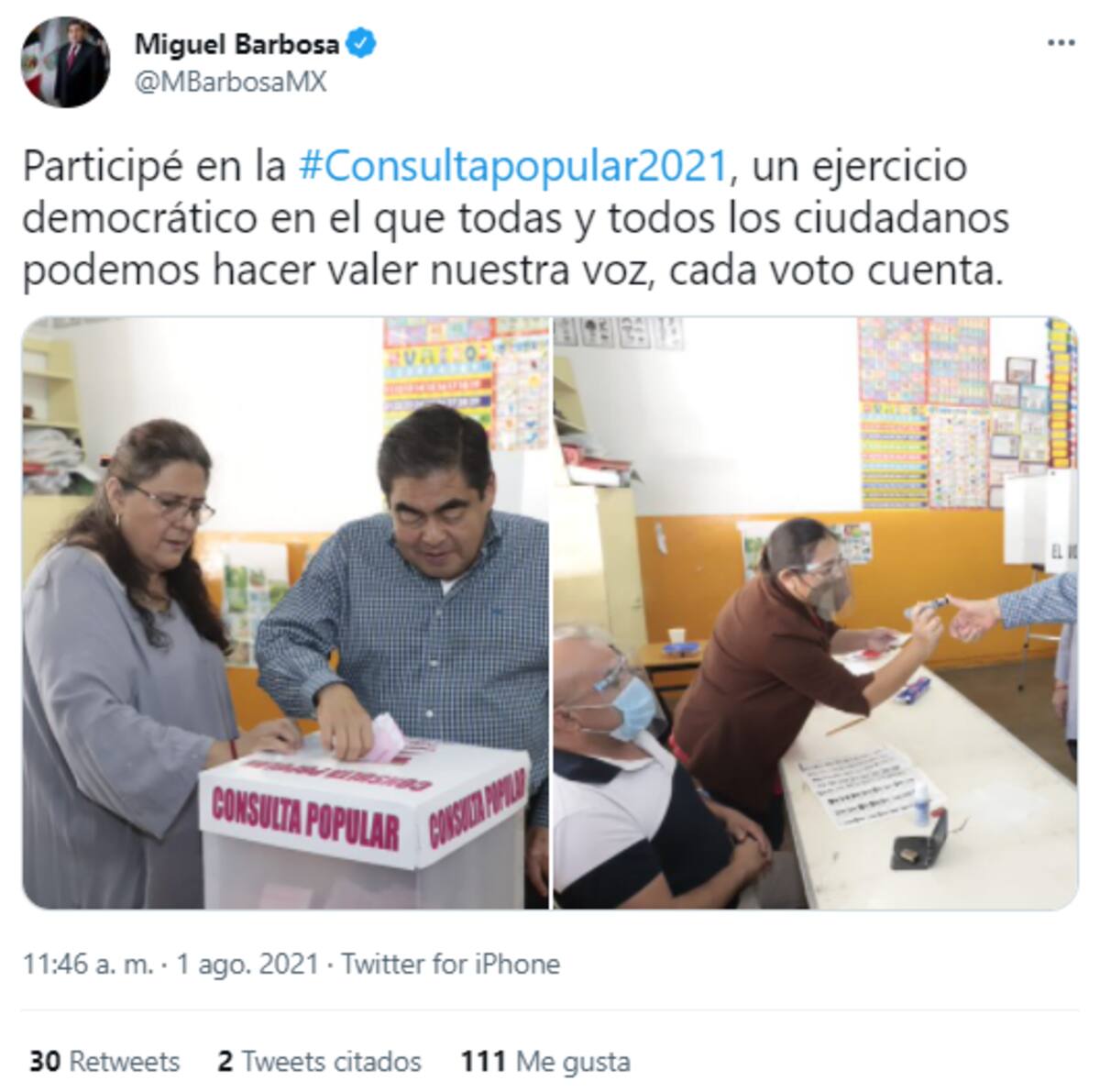 Por su parte, el gobernador de Puebla, Miguel Barbosa, también acudió a su casilla correspondiente para participar en este ejercicio de la democracia.