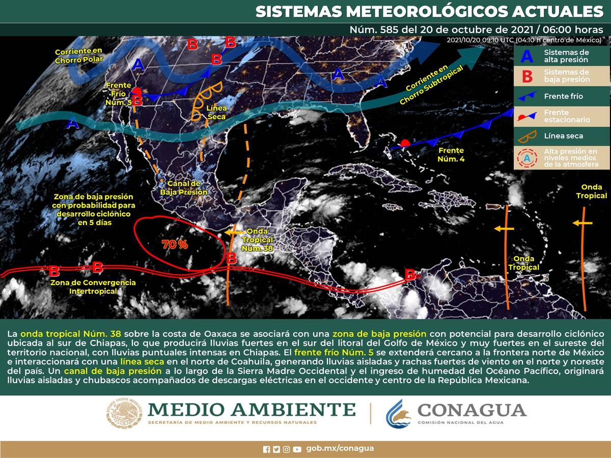 CIUDAD DE MÉXICO.- Para este miércoles 20 de octubre, la onda tropical Núm. 38 se desplazará sobre la costa de Oaxaca y se asociará con una zona de baja presión con potencial para desarrollo ciclónico ubicada al Sur de Chiapas, lo que producirá lluvias fuertes en el Sur del litoral del Golfo de México y muy fuertes en el Sureste del territorio nacional, con lluvias puntuales intensas en Chiapas.