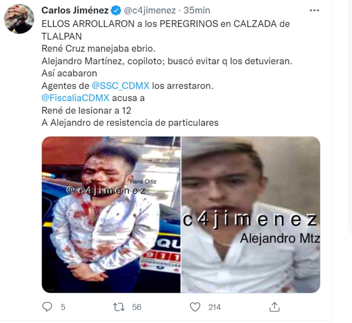 CIUDAD DE MÉXICO.-Esta tarde han revelado la identidad de los presuntos culpables de atropellar a 12 peregrinos en Calzada de Tlalpan.