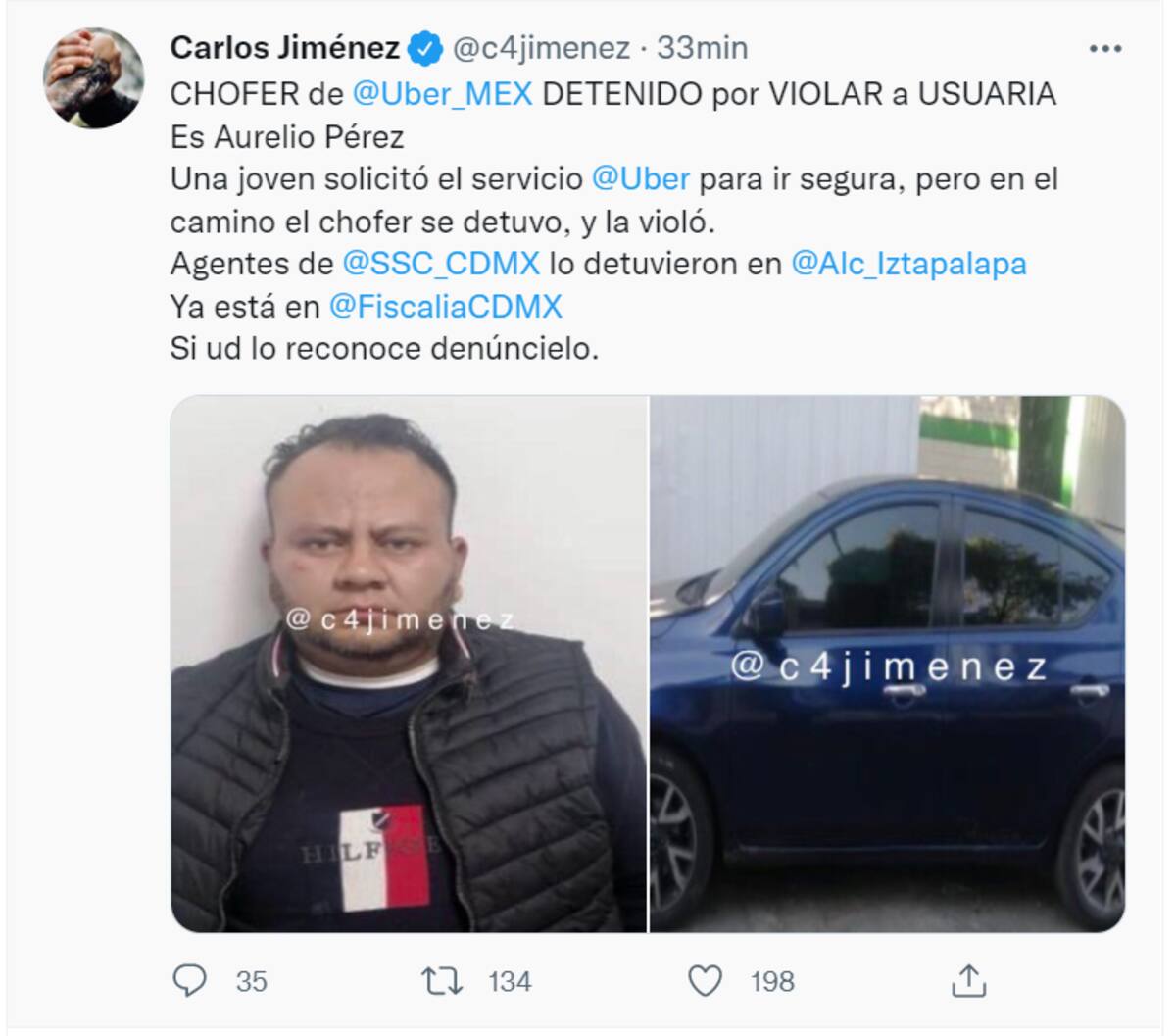 De acuerdo al periodista Carlos Jiménez, una joven solicitó el servicio "para ir <strong>segura</strong>, pero en el camino el chofer se detuvo, y la <strong>violó</strong>".