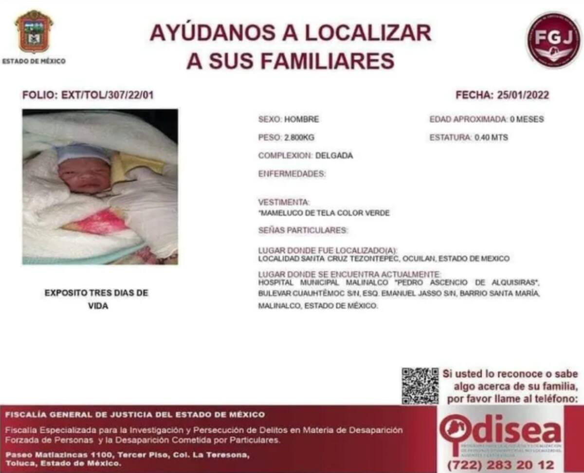 Tras esto las autoridades de la Fiscalía del Estado de México activaron una alerta para localizar a los padres del bebé y determinar su situación jurídica.