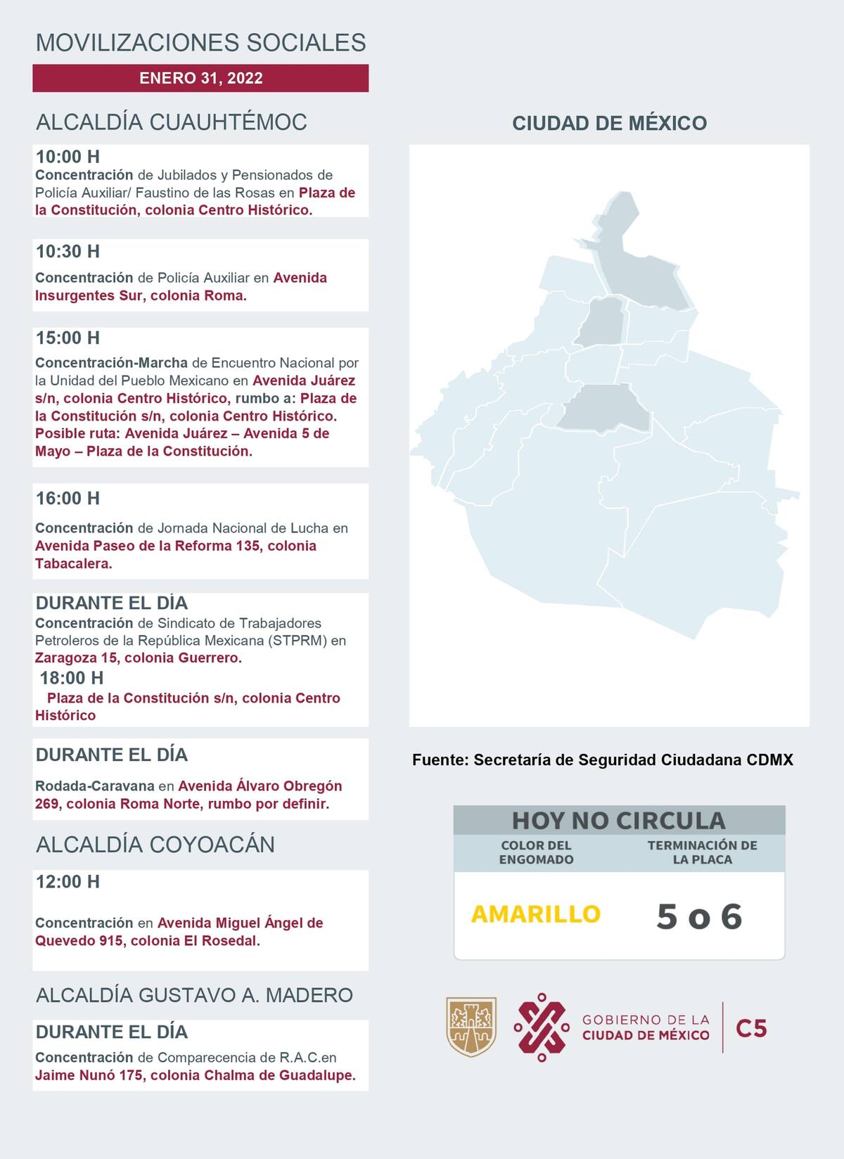 - 15:00 horas: Concentración-Marcha de Encuentro Nacional por la Unidad del Pueblo Mexicano en Avenida Juárez s/n, colonia Centro Histórico, rumbo a: Plaza de la Constitución s/n, colonia Centro Histórico. Posible ruta; Avenida Juárez - Avenida 5 de Mayo - Plaza de la Constitución.