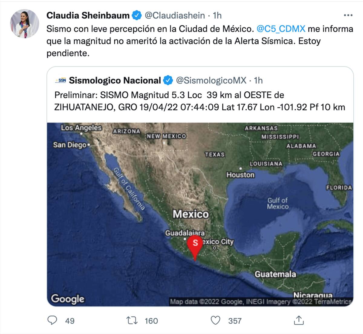 Claudia Sheinbaum, jefa de Gobierno de la Ciudad de México confirmó que el sismo se percibió de manera leve en la ciudad.