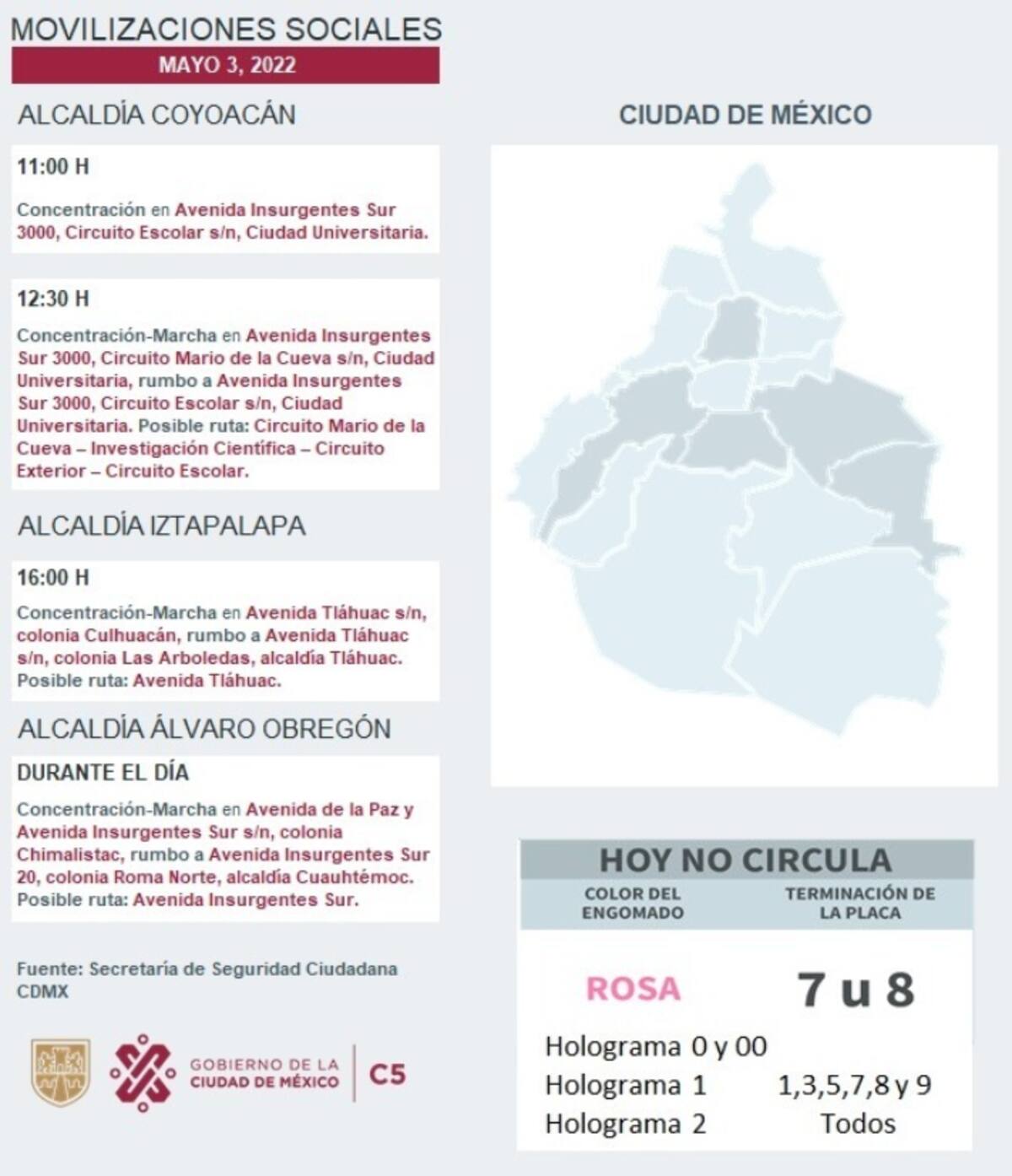 - Concentración-Marcha en Avenida de la Paz y Avenida Insurgentes Sur, colonia Chimalistac, rumbo a Avenida Insurgentes Sur 20, colonia Roma Norte, alcaldía Cuauhtémoc. Posible ruta: Avenida Insurgentes Sur.