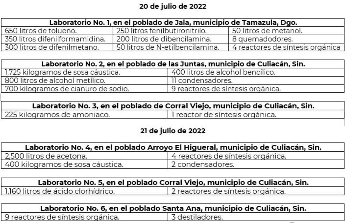 SINALOA.- La Secretaría de la Defensa Nacional informó que los días 20, 21 y 22 de julio de 2022, personal del Ejército Mexicano colaboró con la Guardia Nacional para realizar el aseguramiento de ocho laboratorios clandestinos, dedicados a la elaboración de droga sintética en los estados de Sinaloa y Durango.