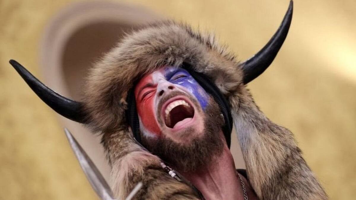 Uno de los manifestantes, que ingresó al edificio con ropa vikinga, lucía un letrero que decía "Q me envió aquí", en referencia al nombre en clave del usuario de internet que inició la teoría de la conspiración de QAnon.