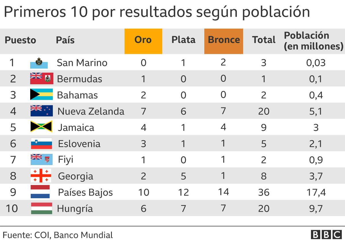 En este escenario, la pequeña nación de San Marino, que tiene poco más de 33.000 habitantes, encabeza la lista, aunque sólo ganó tres medallas en Tokio. EE.UU. ni siquiera entró en los primeros 20, colocándose en el puesto 60.