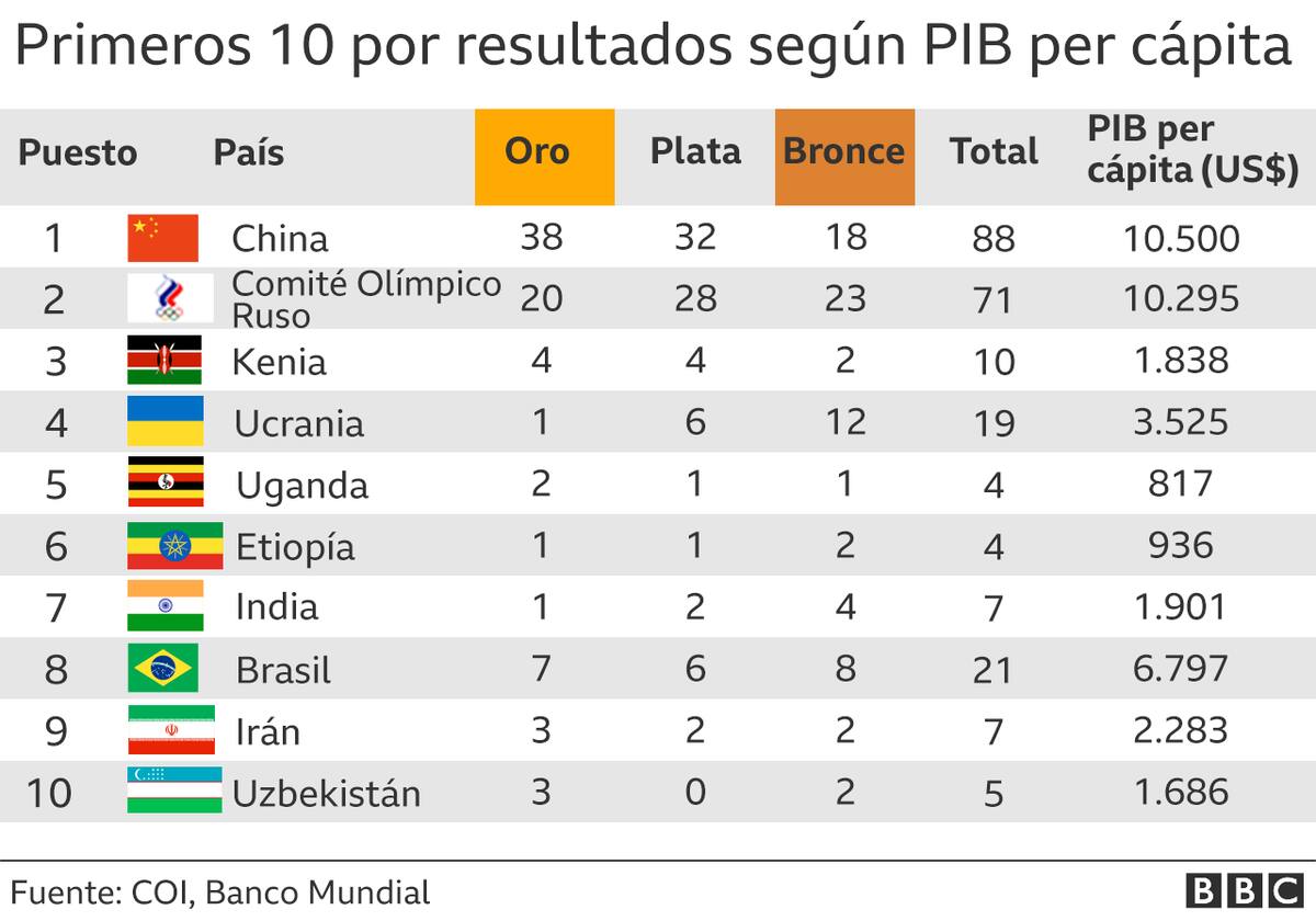 Cuando se toma en consideración el promedio de ingresos nacionales per cápita, a China y Rusia (segundo y tercero en total de medallas) les fue mejor que a EE.UU. Según estos rankings alternativos, China ocupa el primer lugar, Rusia el segundo, con Kenia entrando tercero.
