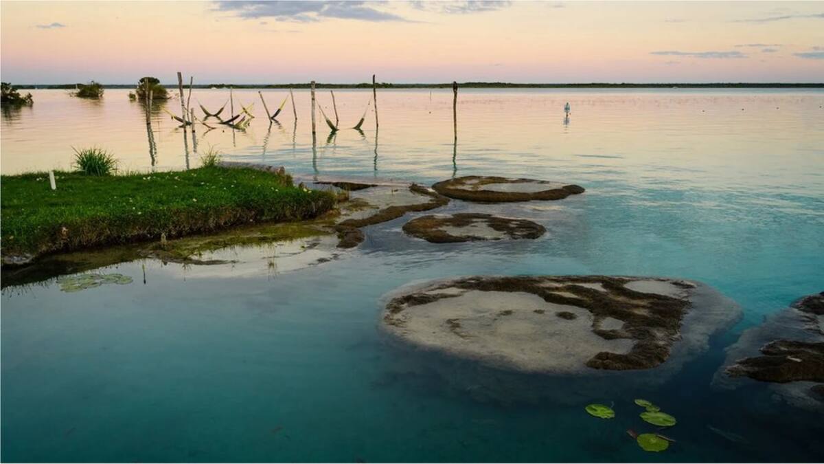 Famoso por sus brillantes siete tonos de azul, el lago mexicano de Bacalar alberga una antigua población de estromatolitos que tienen alrededor de 3.500 millones de años.