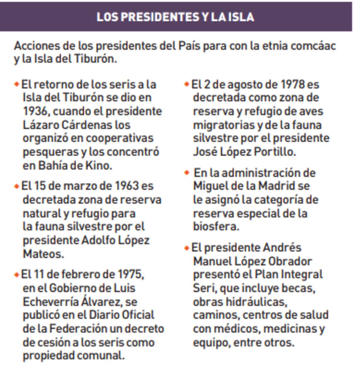 La Isla del Tiburón es como un sitio sagrado, pues todo de la isla, sí, es la vida de los antepasados... ahí nacieron, ahí crecieron, ahí andaban los comcáac", comentaba don Antonio, según documenta la investigadora Diana Luque Agraz en su libro Naturaleza, Saberes y Territorio Comcáac.