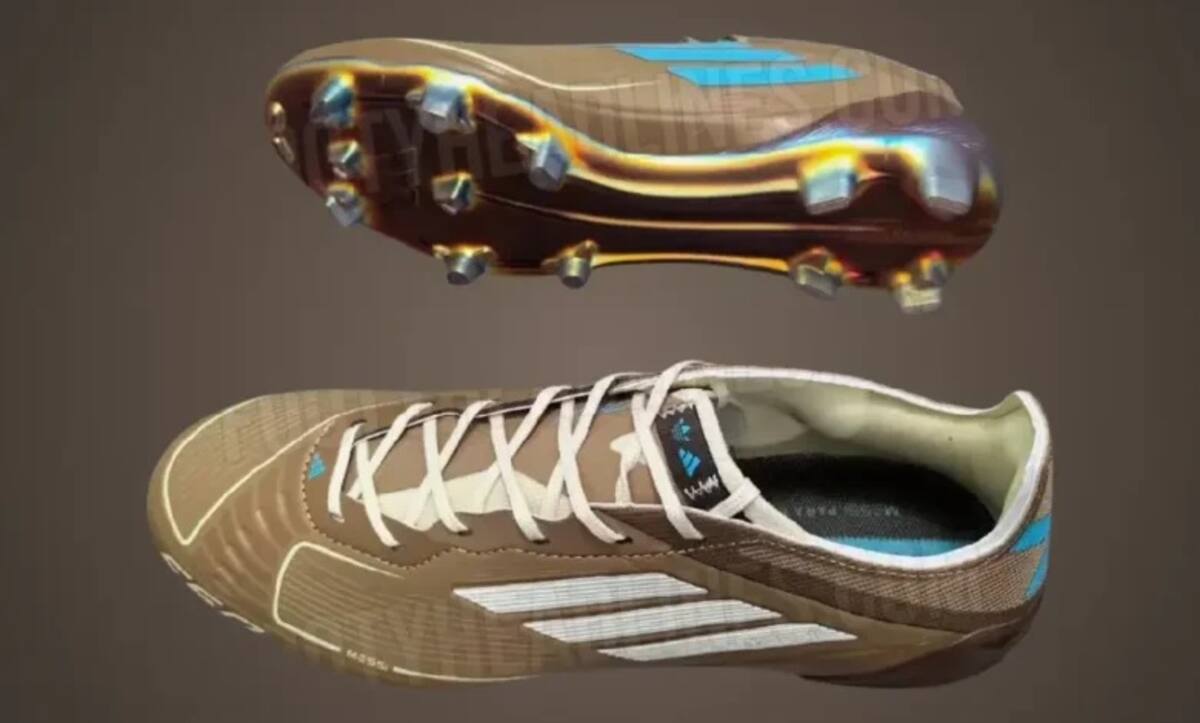 Las primeras imágenes filtradas por Footy Headlines revelan un diseño audaz y llamativo. El dorado predomina en la mayor parte del calzado, contrastando con detalles en turquesa que le confieren un toque de frescura. La lengüeta del zapato, por su parte, lleva una inscripción que reza “Messi para Bad Bunny”, acompañada de los logotipos de Adidas.