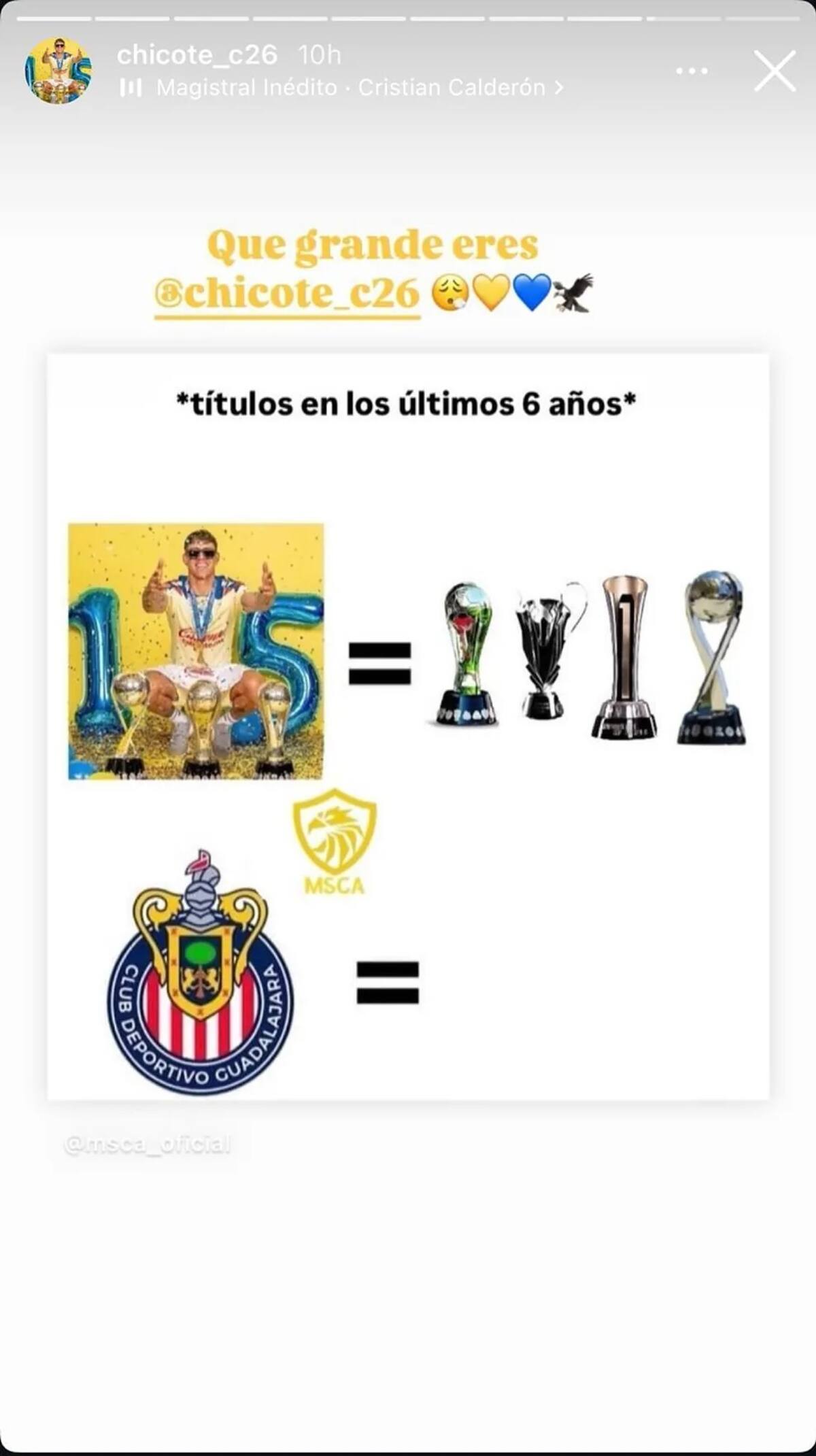 La cuenta de Instagram de los fanáticos de Calderón fue aún más directa. Realizaron una publicación con el texto que decía: “Qué grande eres ‘Chicote’ Calderón. Títulos en seis años:” En la parte inferior de la publicación, colocaron la fotografía de Calderón con los cuatro trofeos obtenidos con el América, mientras que más abajo, el logo de Chivas sin ningún trofeo, haciendo una clara alusión a su sequía de títulos.