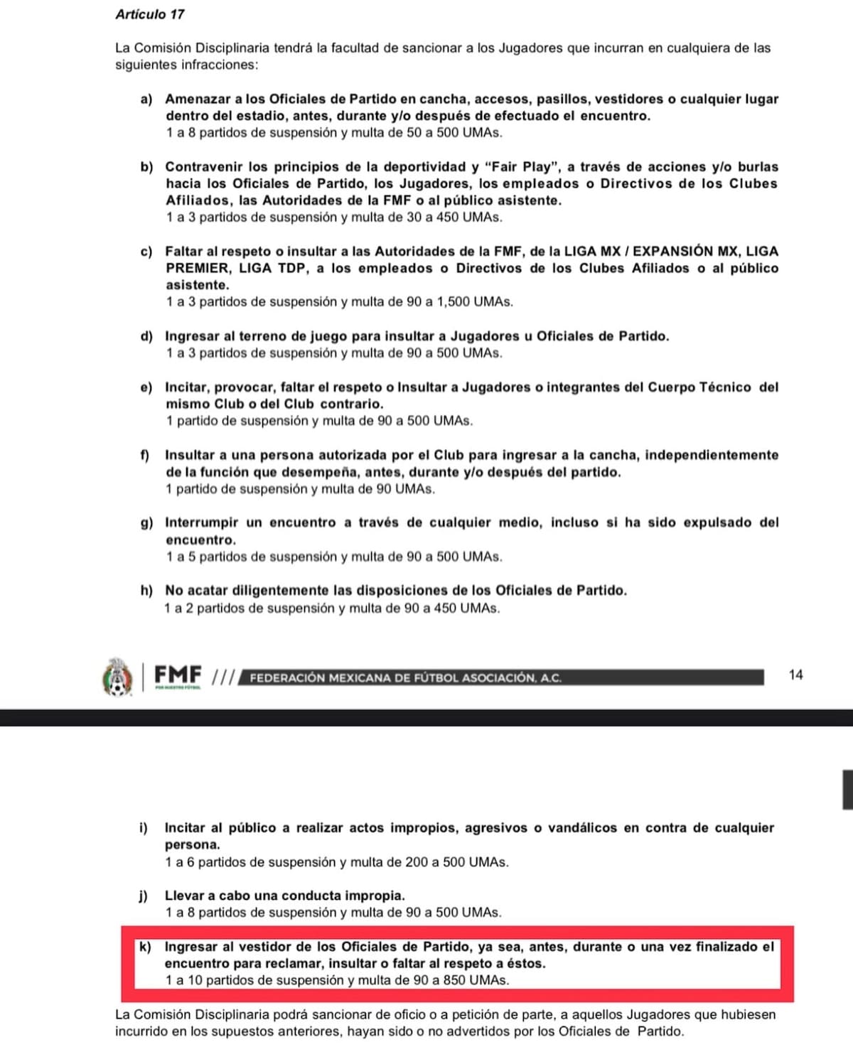 Ingresar al vestidor de los Oficiales de Partido, ya sea, antes, durante o una vez finalizado el encuentro para reclamar, insultar o faltar el respeto... 1 a 10 partidos de suspensión y una multa de 90 a 850 UMAs.”