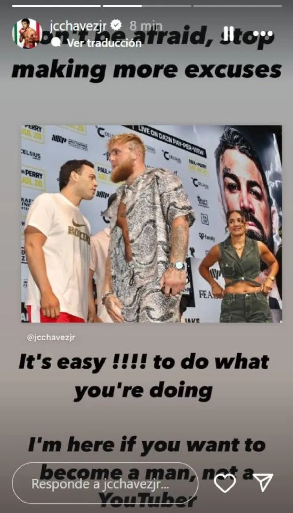 En una reciente publicación en sus historias de Instagram, Chávez Jr. respondió de manera directa a las declaraciones de Paul, quien había afirmado no estar interesado en una pelea con el mexicano.