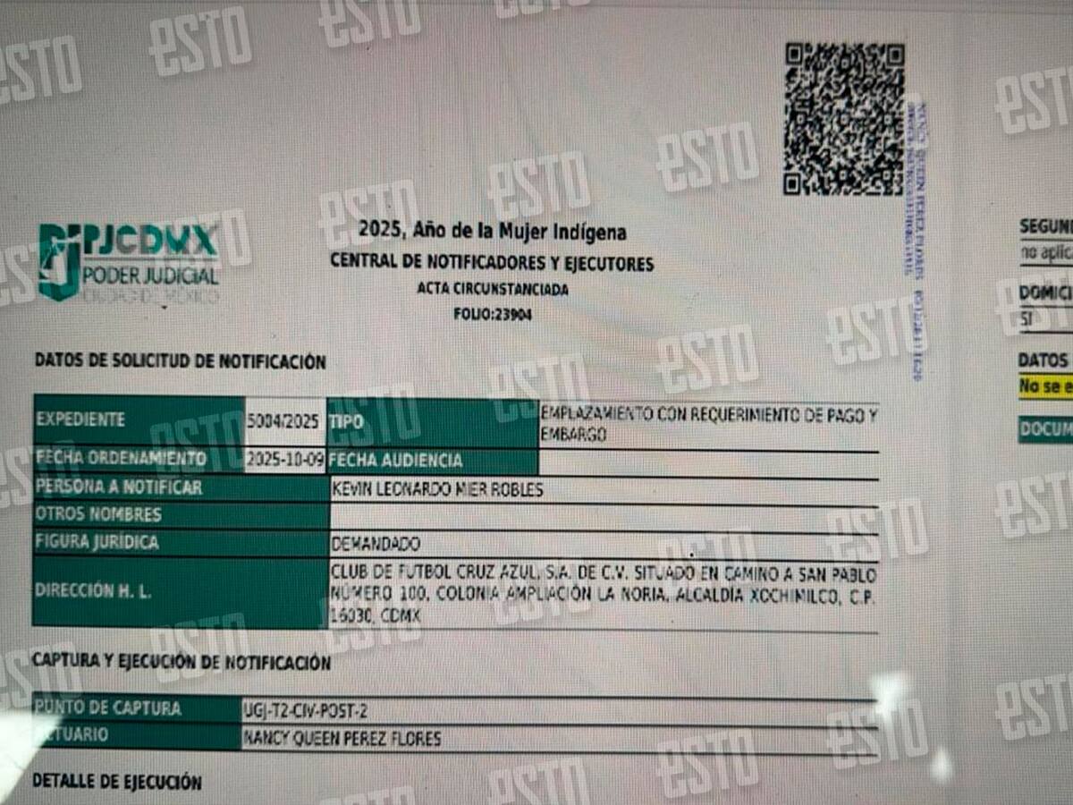 La notificación oficial fue entregada el pasado 13 de noviembre en las instalaciones de Cruz Azul, donde un representante jurídico del club recibió el documento en nombre del portero.