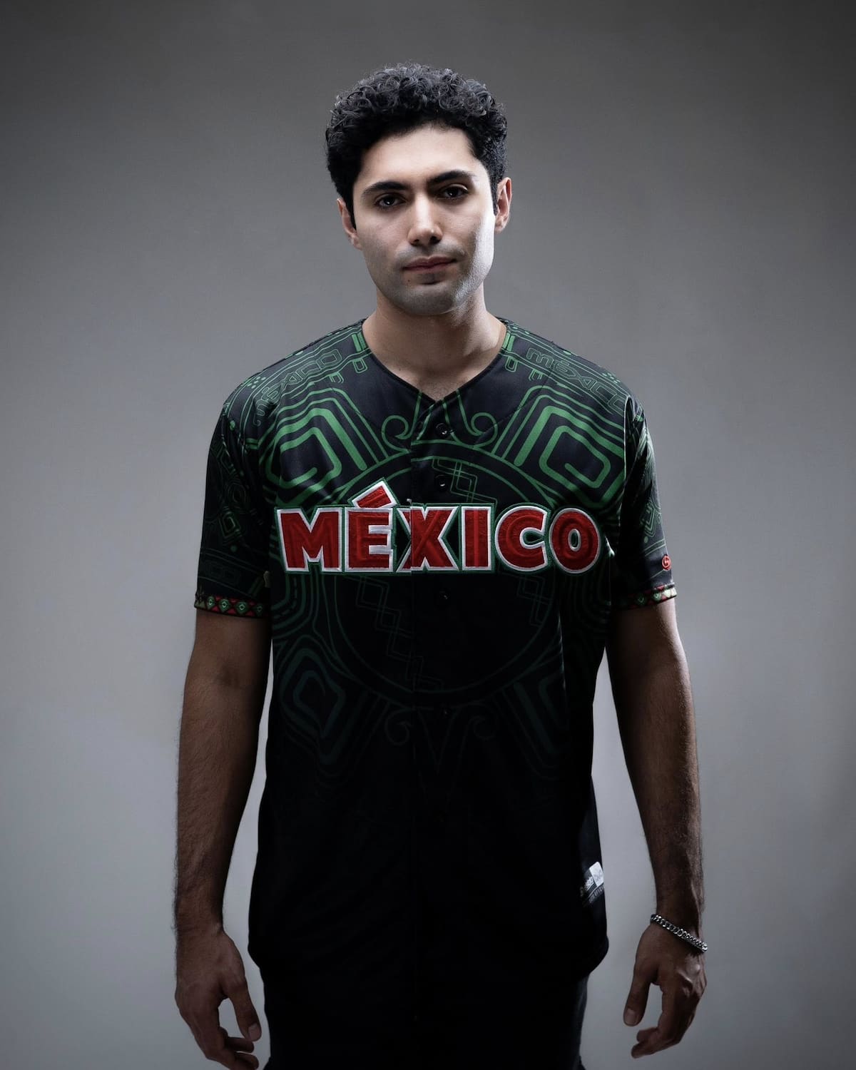 El primer jersey utiliza un fondo negro acompañado de patrones geométricos inspirados en el arte azteca, resaltados en tonos verdes. El nombre “México”, en rojo con bordes tricolores, domina el pecho. Es un diseño sobrio, fuerte y ceremonioso, ideal para juegos de noche y momentos de protocolo.