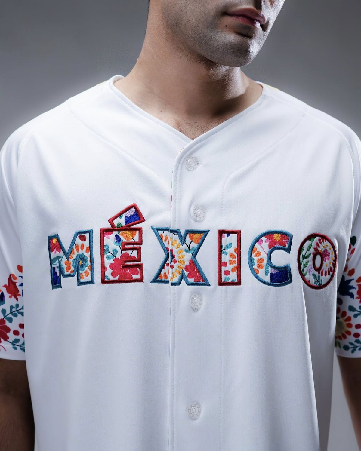 El tercer jersey cambia por completo de estilo y adopta motivos florales multicolor, tanto en las mangas como dentro de las letras de “México”. Inspirado en textiles mexicanos, este diseño es vibrante, festivo y representativo de la diversidad cultural del país.
