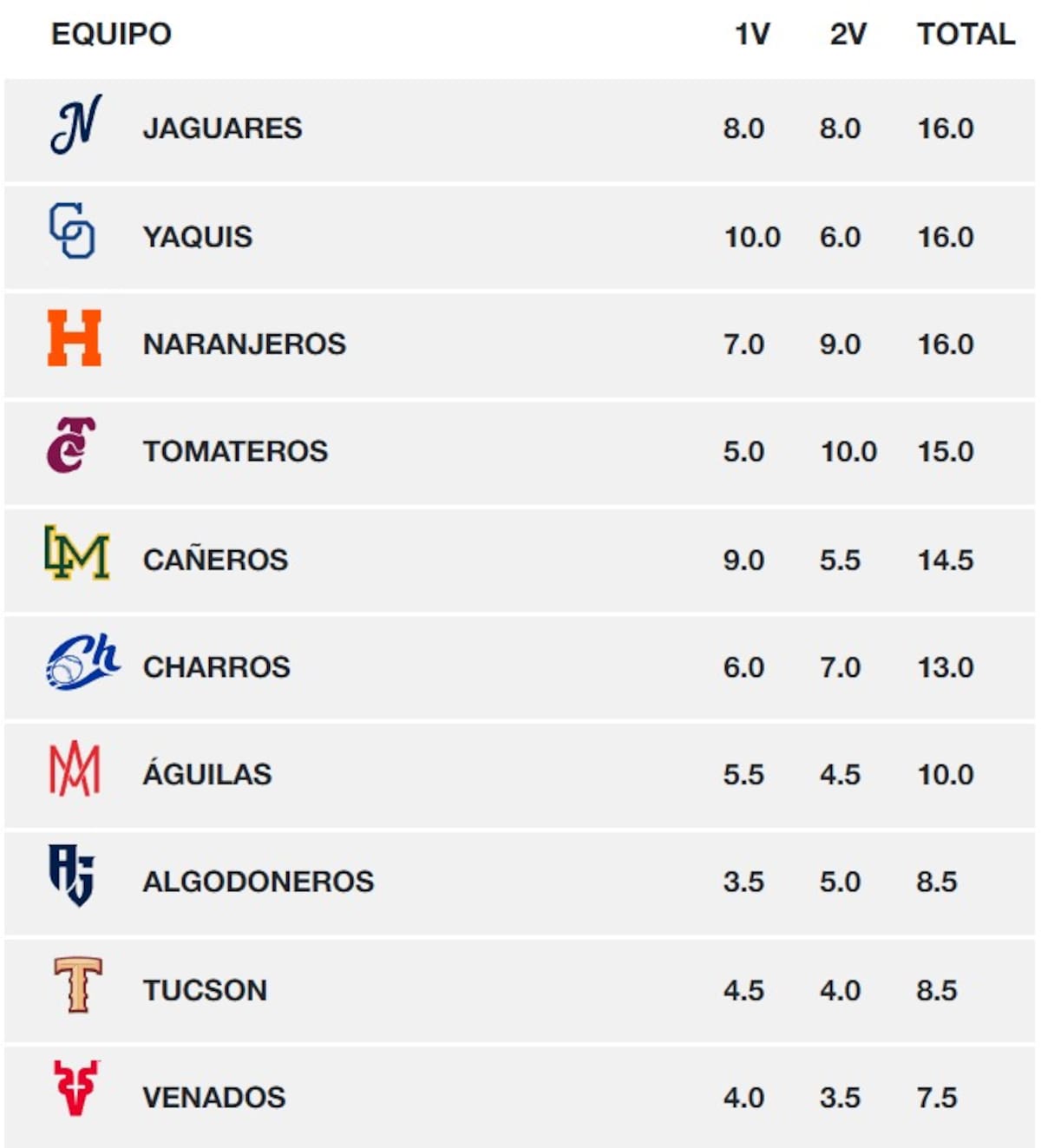Tres equipos terminaron empatados tanto en puntos como en récord general. Jaguares de Nayarit, Yaquis de Ciudad Obregón y Naranjeros de Hermosillo finalizaron con 16 puntos y marca de 40-28.