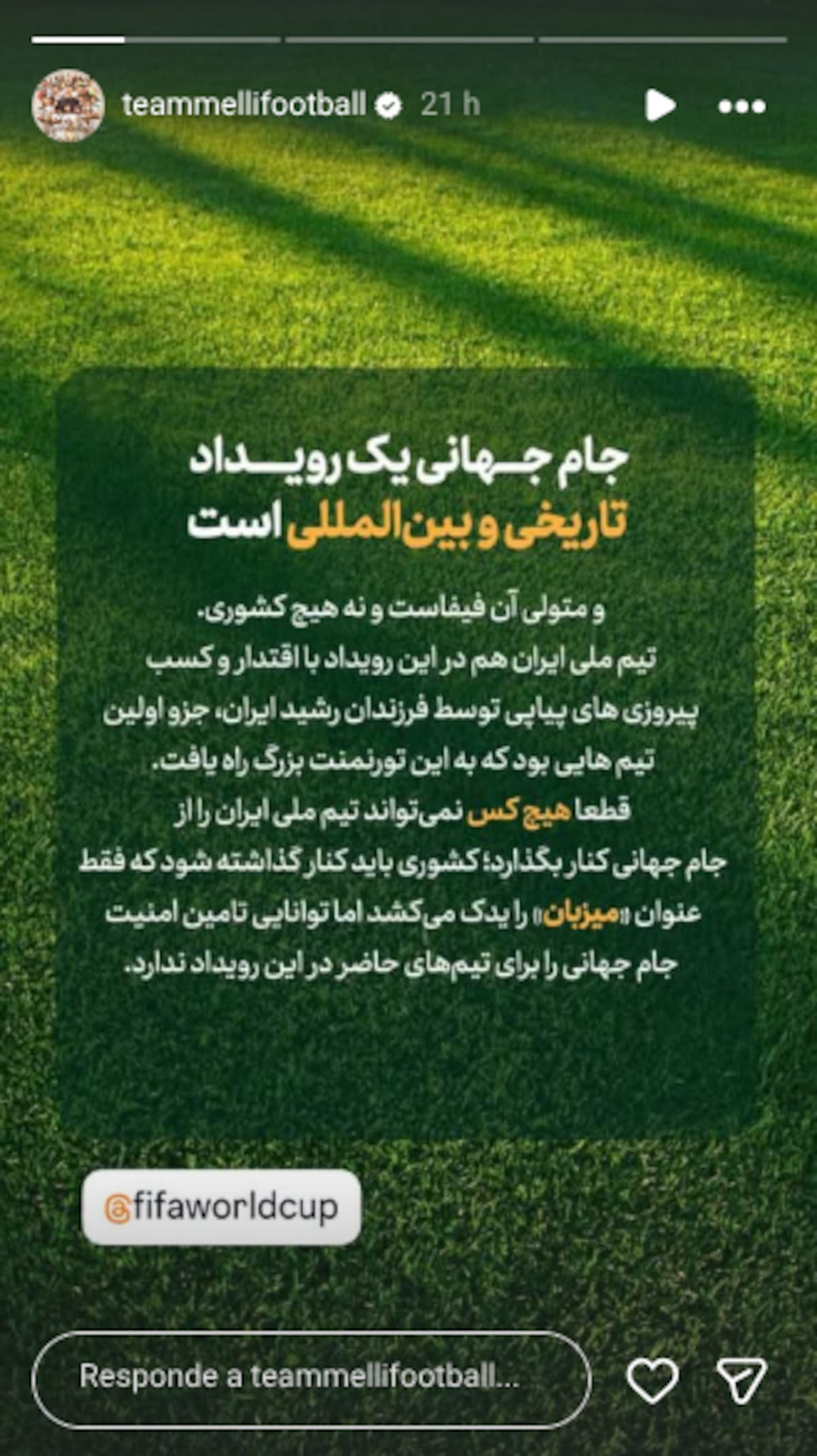 La Copa del Mundo es un evento histórico e internacional. Su organizador es la FIFA, no ningún país. La selección nacional de Irán también ha participado en este evento con autoridad, logrando victorias consecutivas gracias a los hijos orgullosos de Irán, y fue uno de los primeros equipos en clasificar a este gran torneo”.