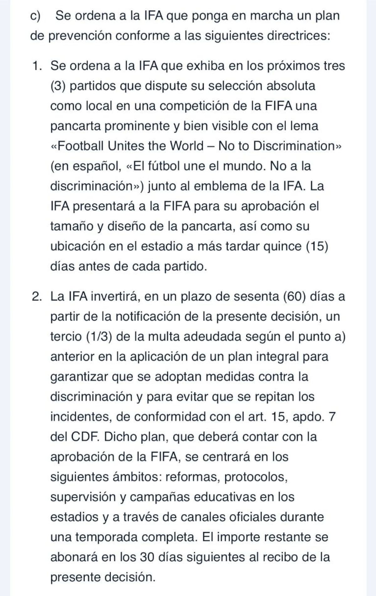 Además, la federación deberá destinar un tercio de la multa a dicho programa, el cual deberá ser aprobado por expertos de la FIFA y ejecutado durante una temporada completa.