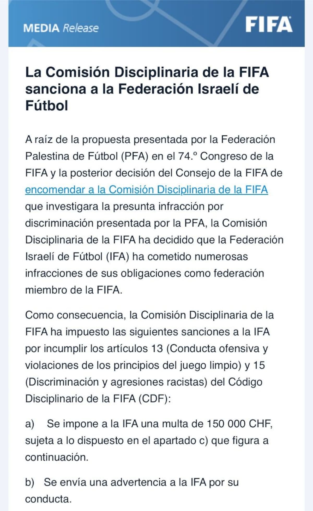 La queja de la Federación Palestina de Futbol derivó en el castigo por violar los artículos 13 y 15 del Código Disciplinario de la FIFA.