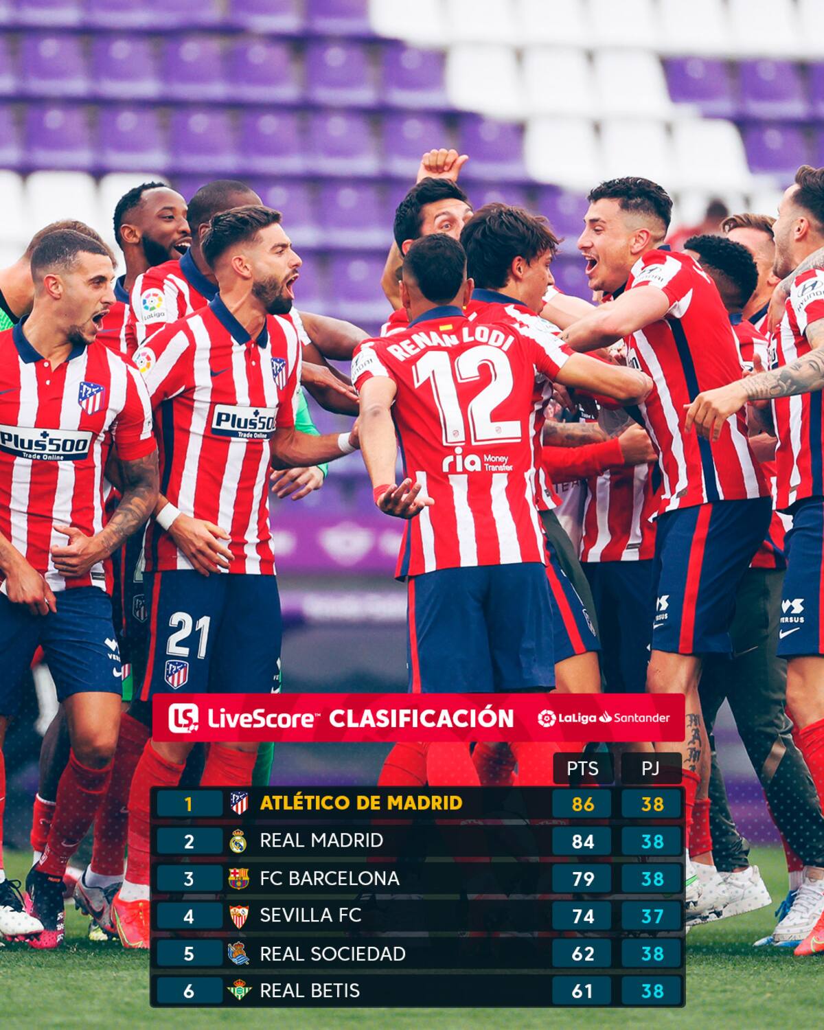 El Atlético terminó en la cima de la tabla de posiciones con 86 puntos, dos más que el equipo merengue. Barcelona, que cerró con un triunfo de 1-0 sobre el Eibar, fue tercero con 79 unidades.