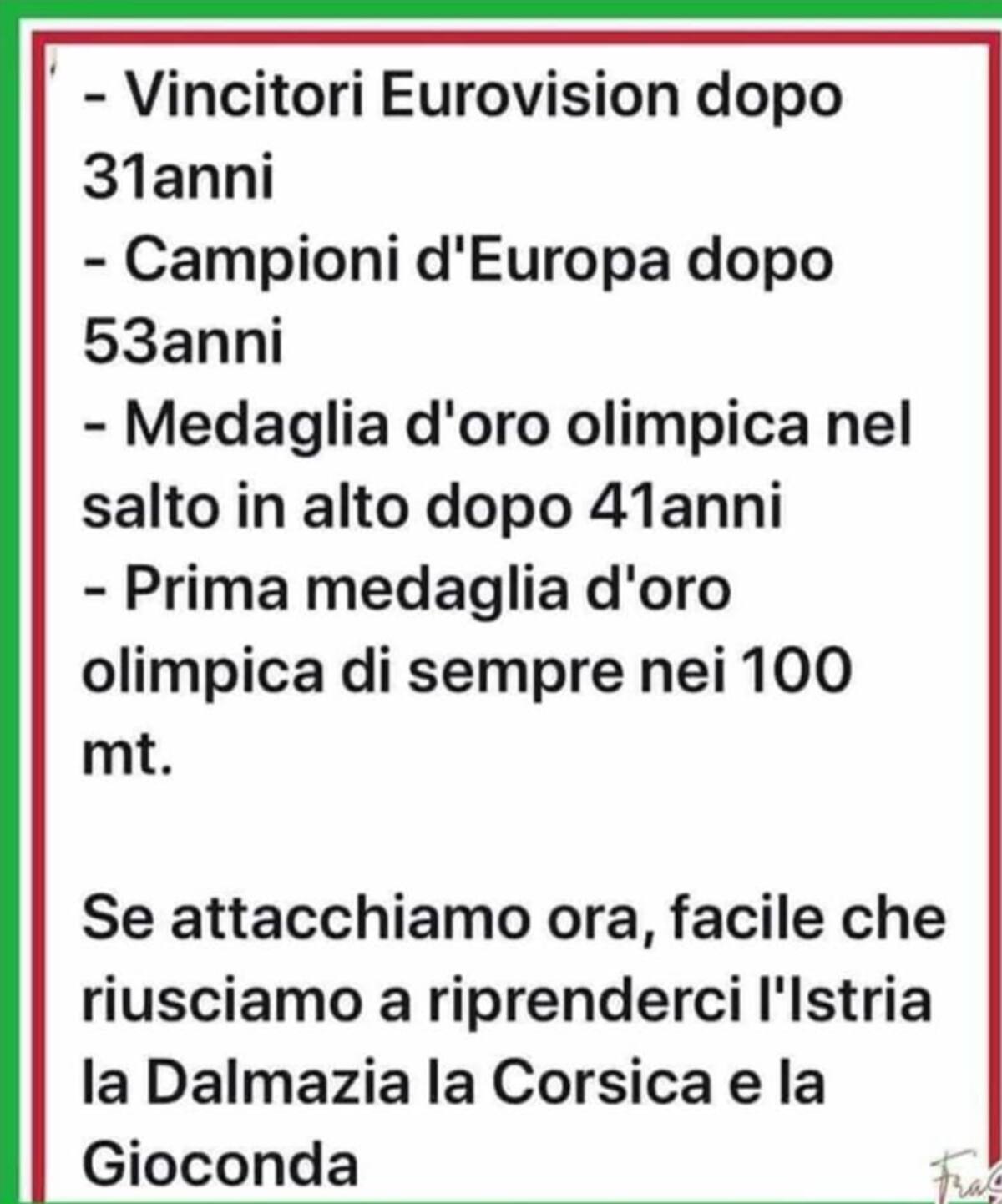 "Ganadores de Eurovisión después de 31 años. Campeones de Europa luego de 53 años. Medalla de oro olímpica en salto de altura tras 41 años. Primera medalla de oro olímpico en los 100 metros. Si atacamos ahora, es fácil que logremos recuperar Istria, Dalmacia, Córcega y la Gioconda".