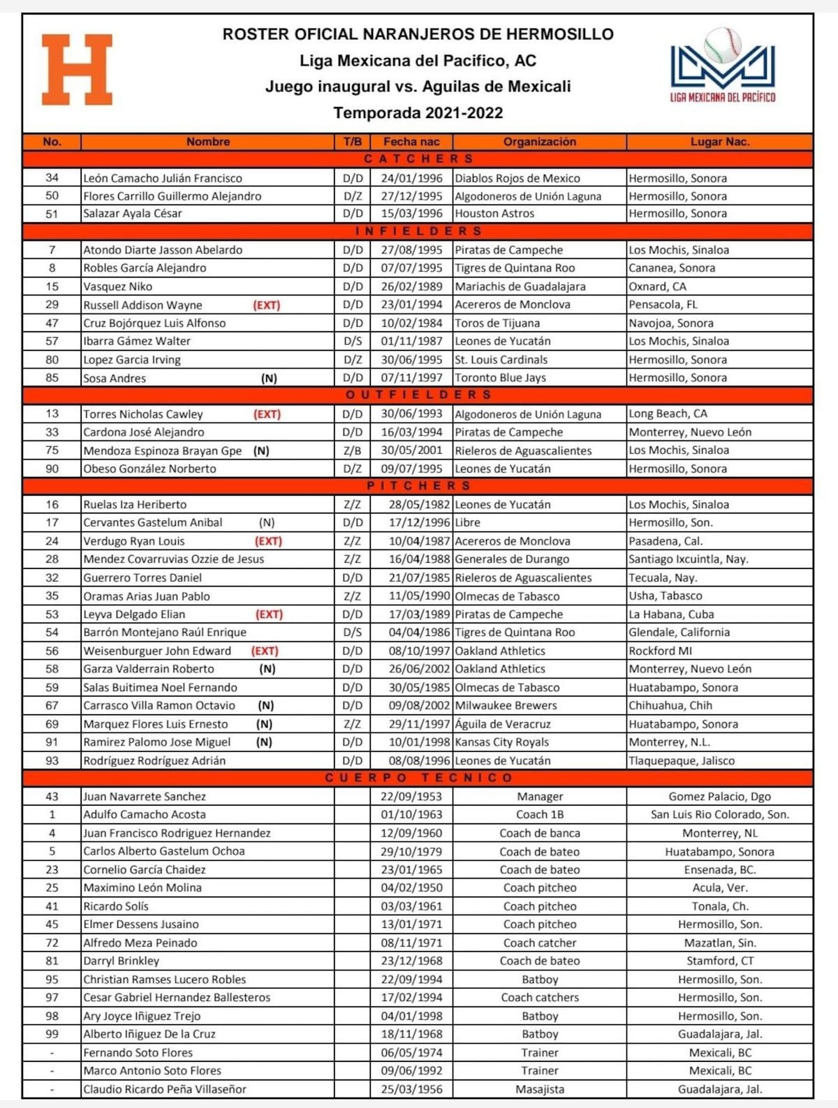 HERMOSILLO, Sonora-. Naranjeros de Hermosillo anunció este martes su roster con el que iniciará la temporada 2021-22 de LMP y con el que enfrentará a Águilas de Mexicali en los dos juegos inaugurales.
