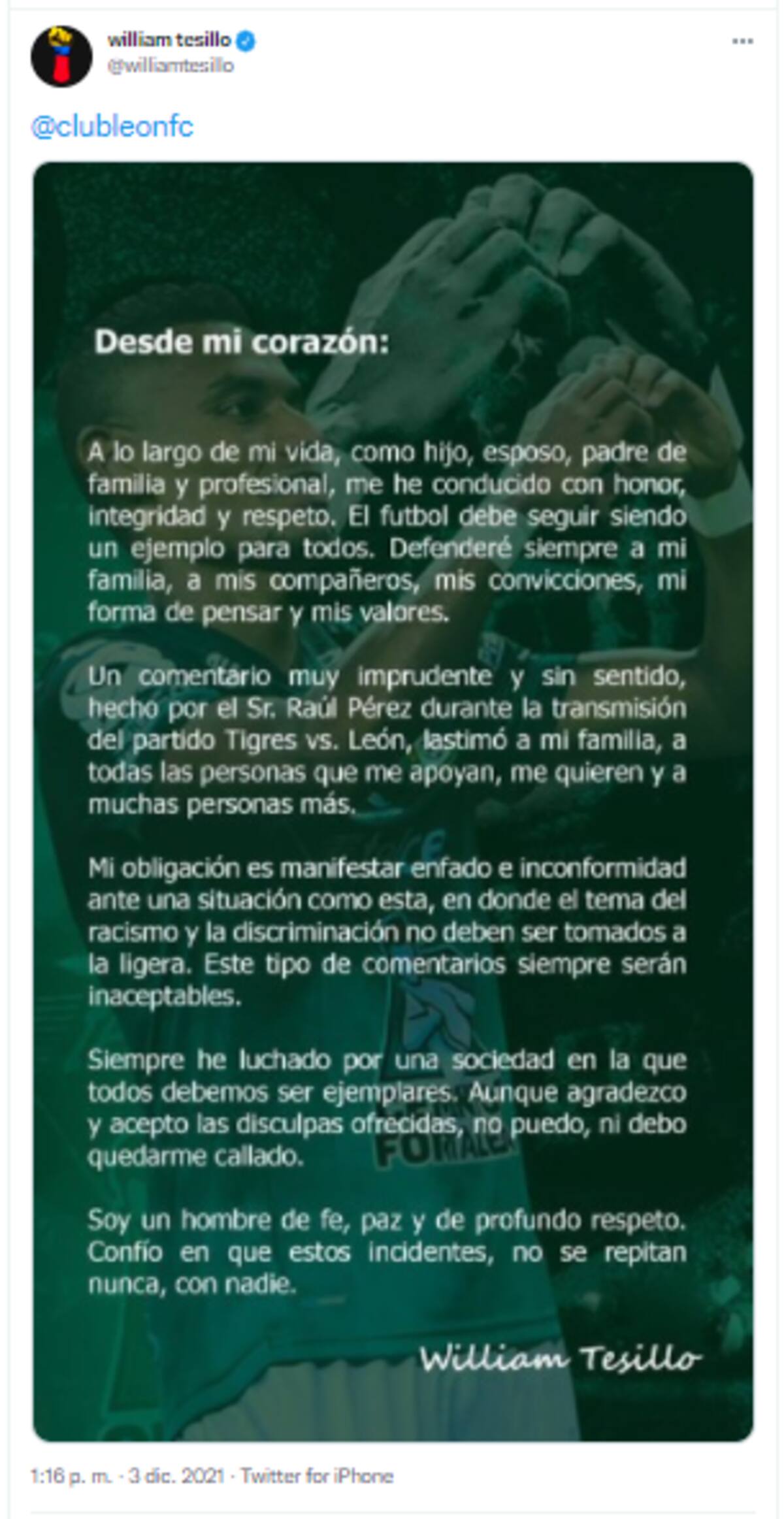 LEÓN, Guanajuato.- William Tesillo reprobó públicamente el comentario racista de Raúl Pérez, narrador de Televisa, quien en el encuentro de las semifinales de ida entre Tigres y León se enfrascó en una polémica.