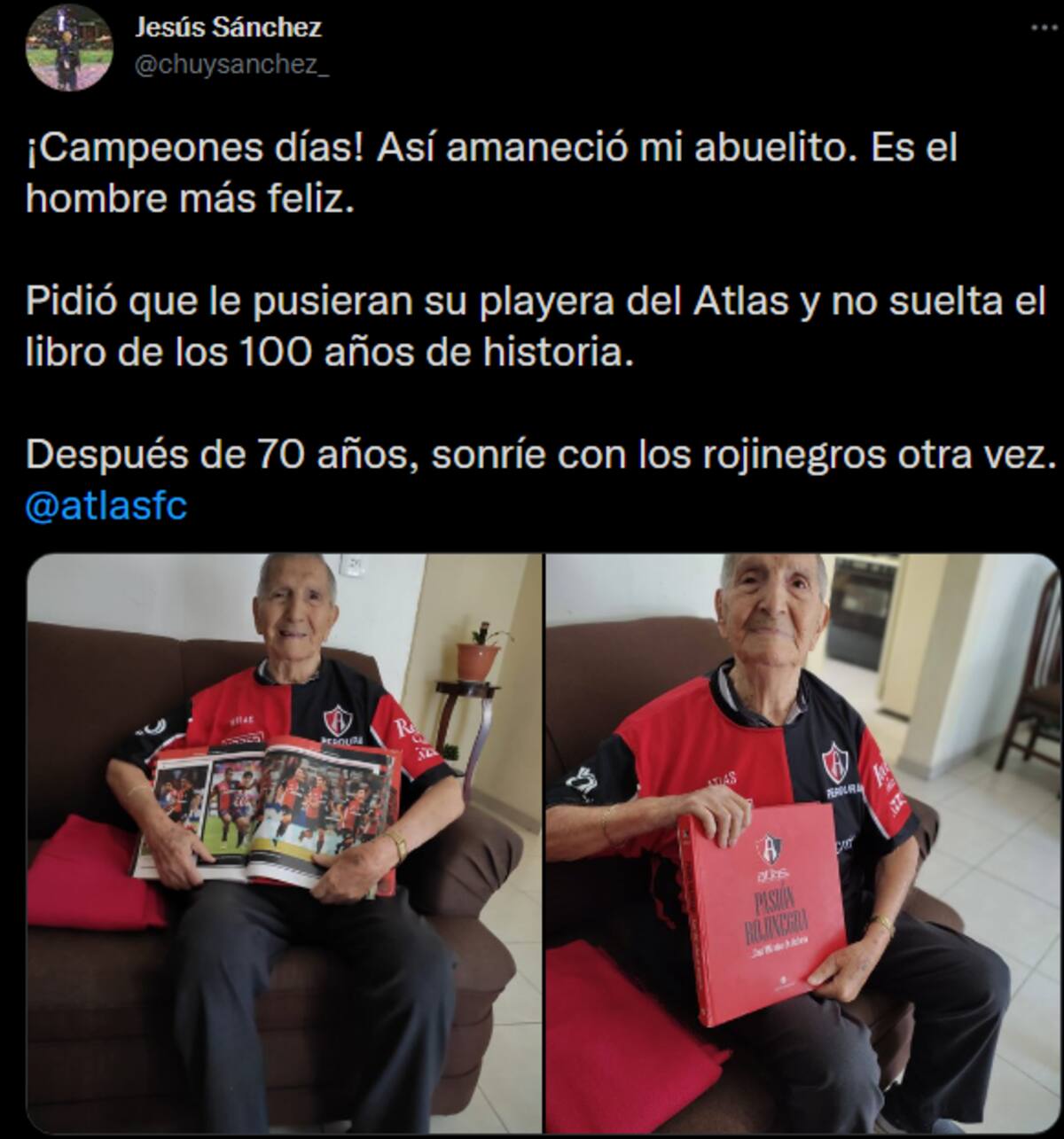 Mi abuelo tiene 91 años y toda la vida ha dicho que no se iba a morir hasta que el Atlas fuera campeón otra vez. Por lo mismo toda mi familia es rojinegra”, escribió Sánchez en su cuenta.