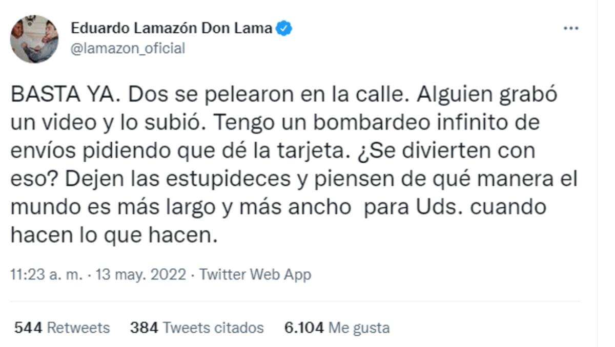 "BASTA YA. Dos se pelearon en la calle. Alguien grabó un video y lo subió. Tengo un bombardeo infinito de envíos pidiendo que dé la tarjeta. ¿Se divierten con eso? Dejen las estupideces y piensen de qué manera el mundo es más largo y más ancho para ustedes cuando hacen lo que hacen", escribió Lamazón.