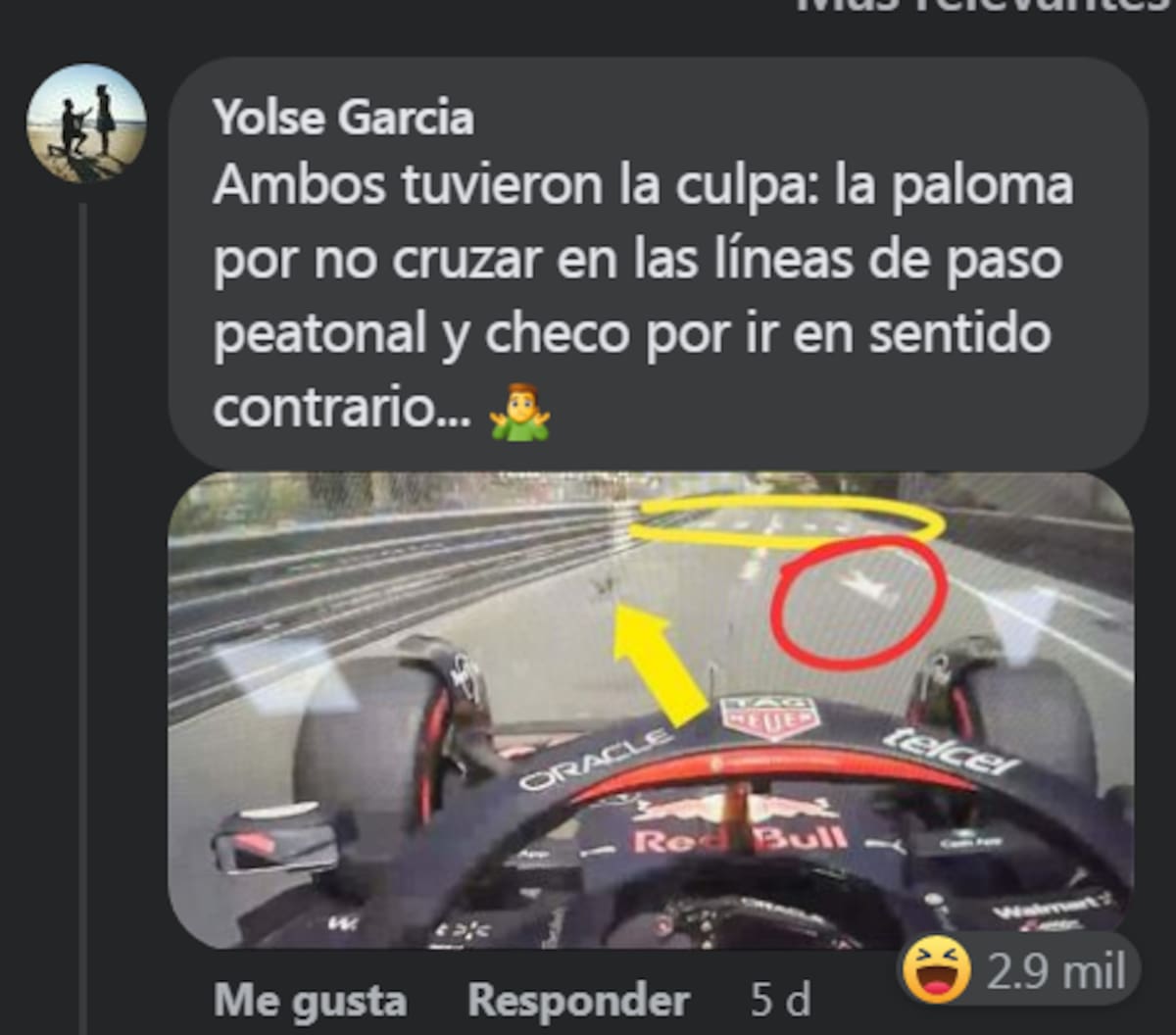 También mencionaban que la paloma preguntó por las placas de Pérez y otro indicó que ambos tenían la culpa, pues mientras el ave no cruzó por "las líneas del paso peatonal", Checo también "iba en sentido contrario".