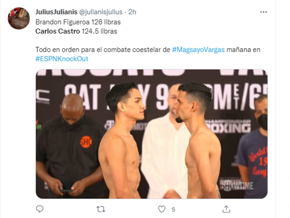 El cajemense subirá al ring con una marca de 27 peleas ganadas (12 nocauts) y solo una perdida, mientras que Brandon Figueroa llegará con 22 triunfos (17 KO's), una derrota y un empate.