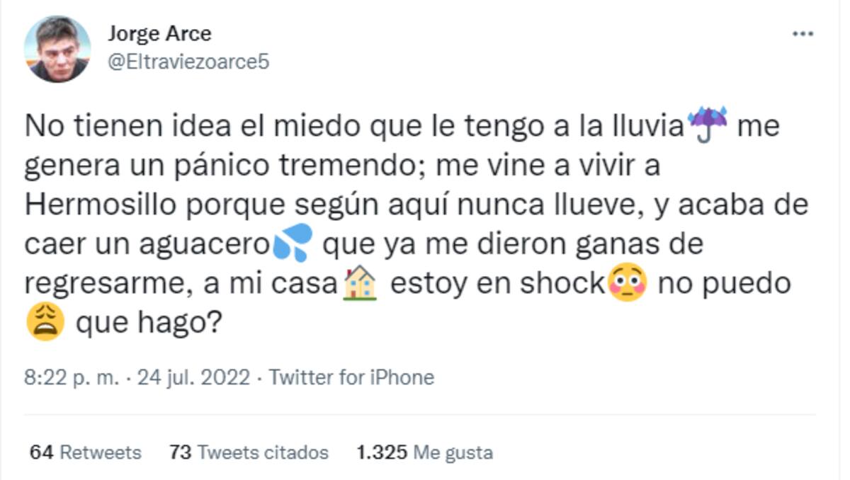 "No tienen idea el miedo que le tengo a la lluvia, me genera un pánico tremendo; me vine a vivir a Hermosillo porque según aquí nunca llueve, y acaba de caer un aguacero que ya me dieron ganas de regresarme a mi casa. Estoy en shock, no puedo, ¿qué hago?", escribió Jorge Arce.
