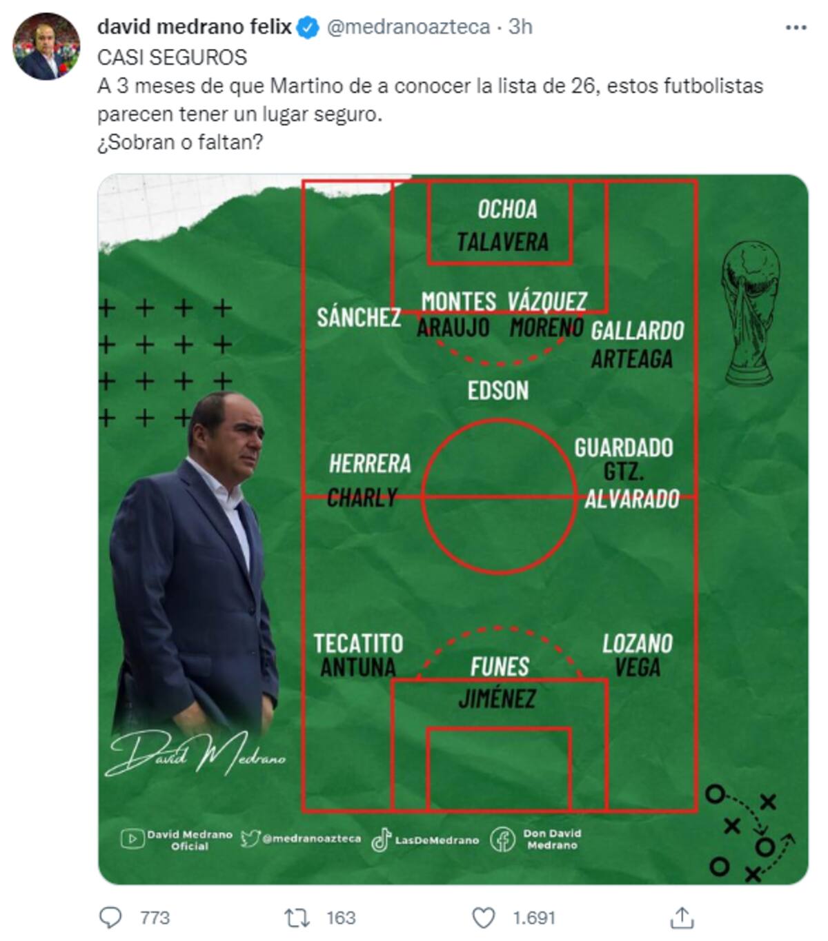 CIUDAD DE MÉXICO-. Aunque varios seleccionados mexicanos han tenido altibajos en los últimos meses, Gerardo 'Tata' Martino ya cuenta con su lista de jugadores que ya tienen su lugar "seguro" en el Mundial Qatar 2022, según David Medrano.